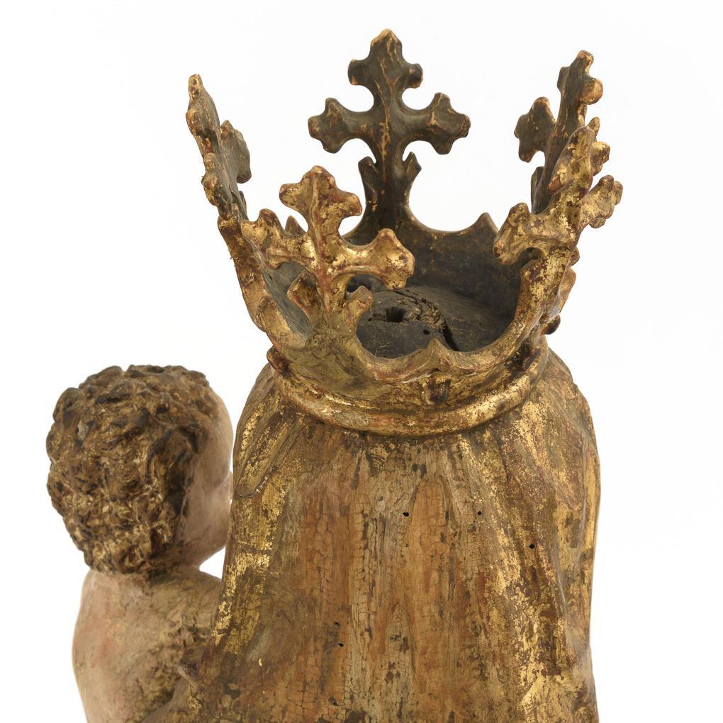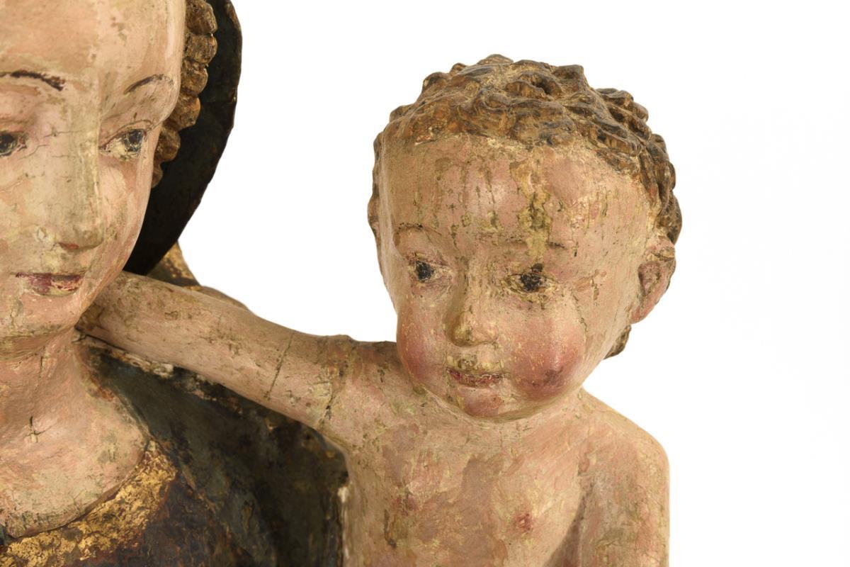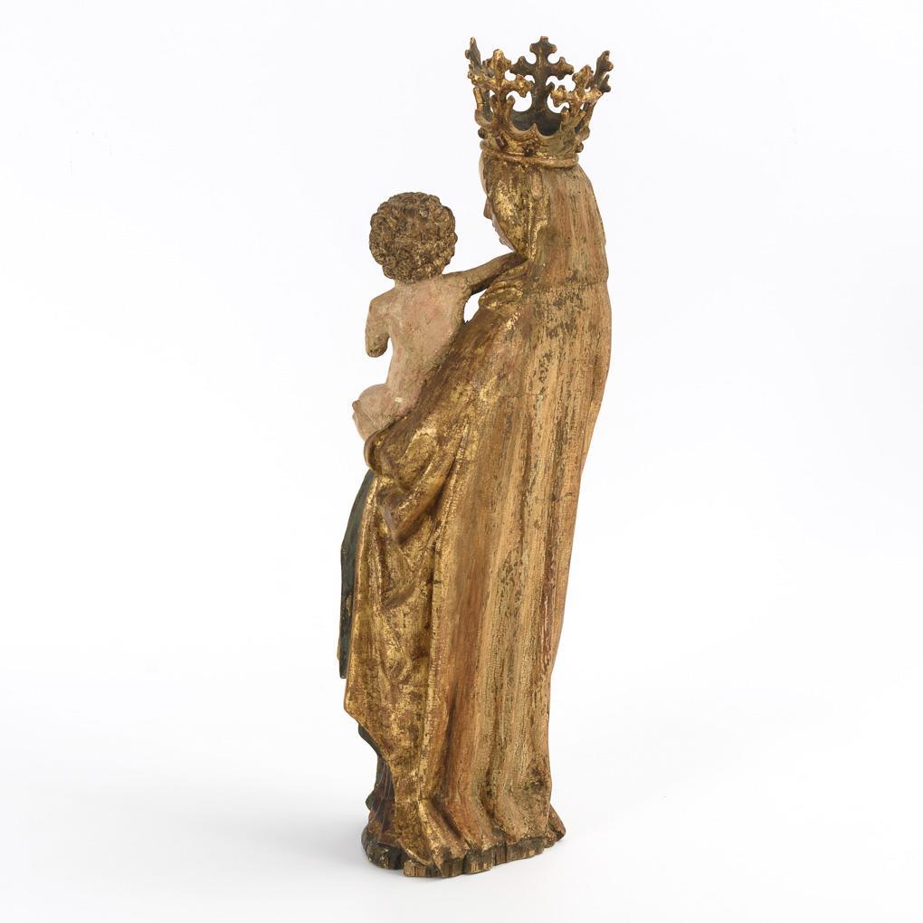 Vollplastische Standfigur der gekrönten Maria im ausgeprägten gotischen Schwung. Mit ihrer Linken hält sie das nackte Jesuskind, das seinen Arm liebevoll in den Nacken der Mutter gelegt hat, während sie mit der Rechten ihm einen Apfel reicht. 1 Unterarm Jesu fehlt, Fehlstelle an der Plinthe und am Gewandsaum, 1 Trockenriss unten, sonst minimale Trockenrisse, minimale Anobienspuren, Fassung übergangen und berieben.