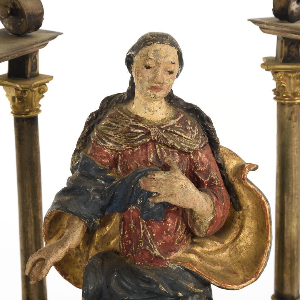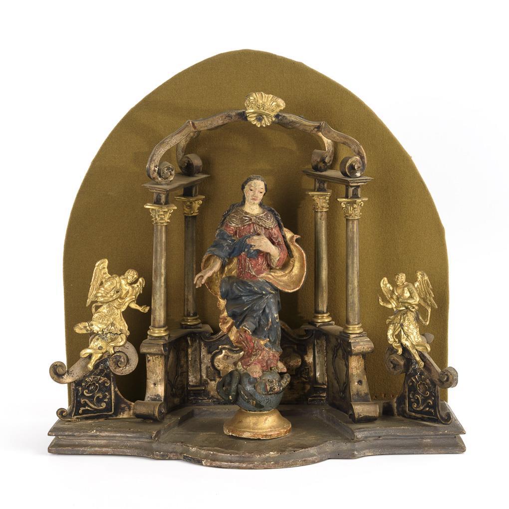 Auf der Weltkugel über der Schlange stehende Jungfrau Maria im faltenreichen Gewand. Gerahmt wird sie von einer Brüstung mit 4 Säulen und geweiften Bögen sowie flankierenden Relief-Engeln. Reparaturen am Blech (beide Engel und 1x an der Wandung), geringe Anobienspuren (inaktiv), Fassung übergangen, Alters-/Gebrauchsspuren.