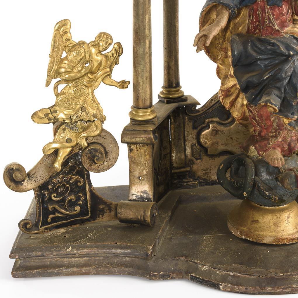 Holz polychrom gefasst, Messingblech und -guss, teils mit silberfarbenem Überzug. 18. Jh. 39 x 45 x 17 cm.