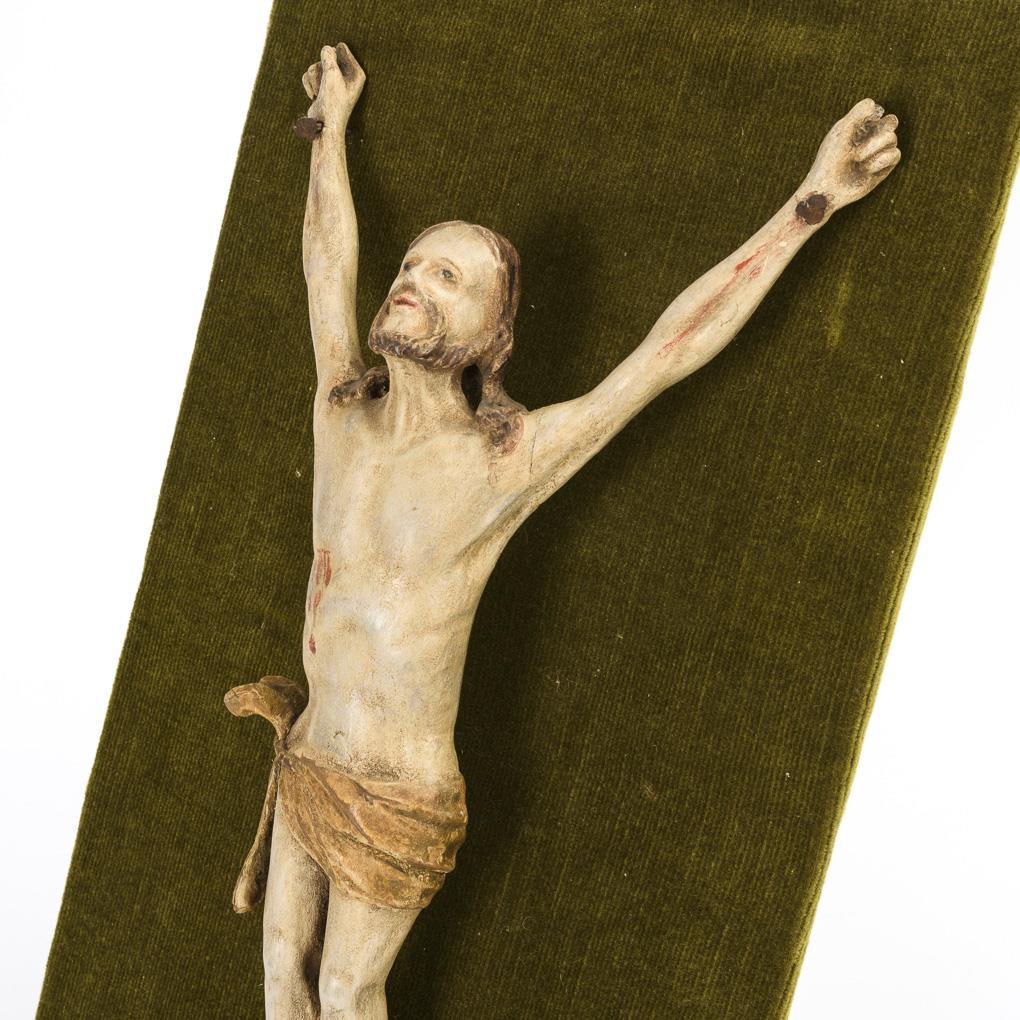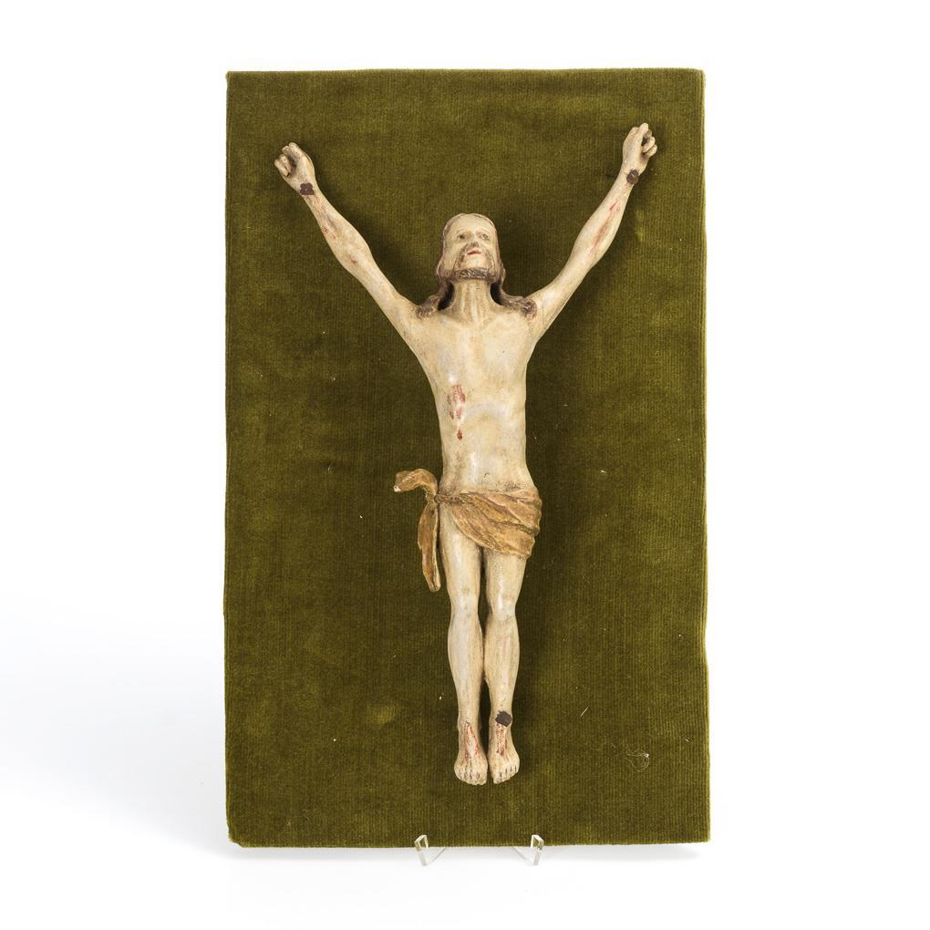 Gerade stehender Christus im Viernageltypus mit steil emporragenden Armen sowie Blick nach oben. 4 Finger und 1 Nagel fehlen, sonst kaum Alters-/Gebrauchsspuren.