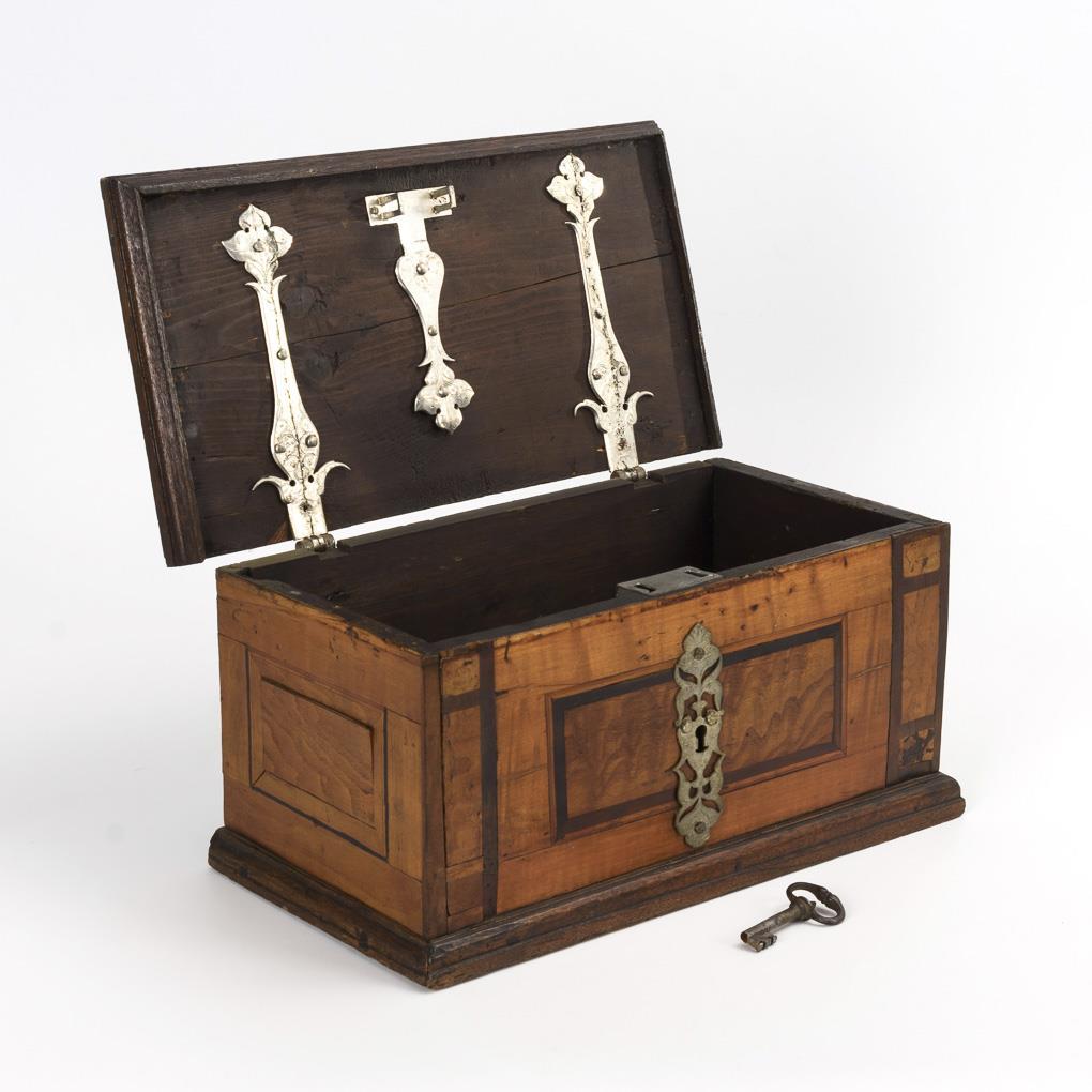 Quaderschatulle mit marketierten Scheinkassetten in der Front, auf dem Scharnierdeckel und an den Seiten sowie vegetabile Schlüssellochblende. Scharnierbänder innen ebenfalls vegetabil verziert und graviert. Wohl originales Schloss. Restauriert, wenige gelöste Furnierstellen, kaum Fehlstellen.