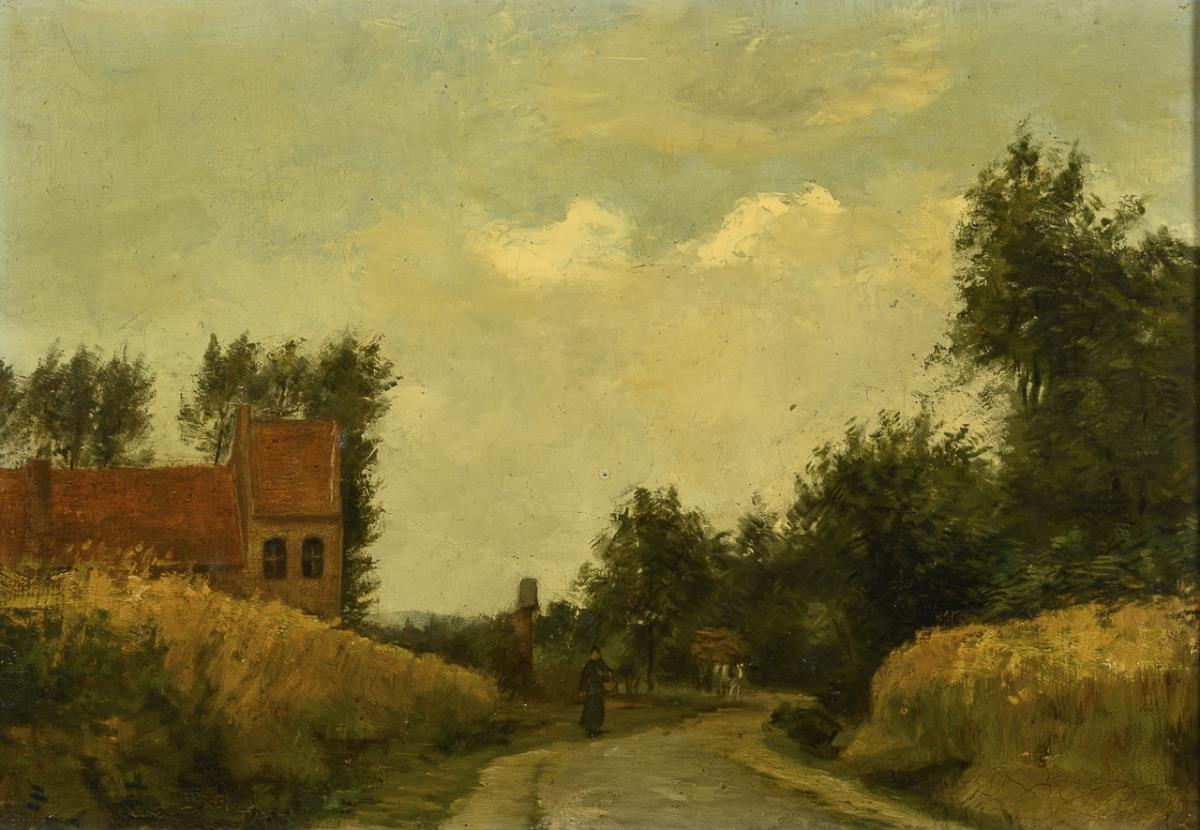 Unsigniert: Frau auf Landstraße mit Kirche