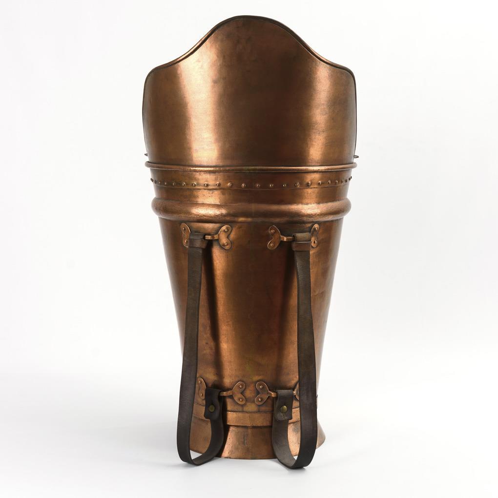 Kupfer, teils getrieben, Messingknauf, innen verzinnt, Leder. H 89 cm, Ø 45 cm.