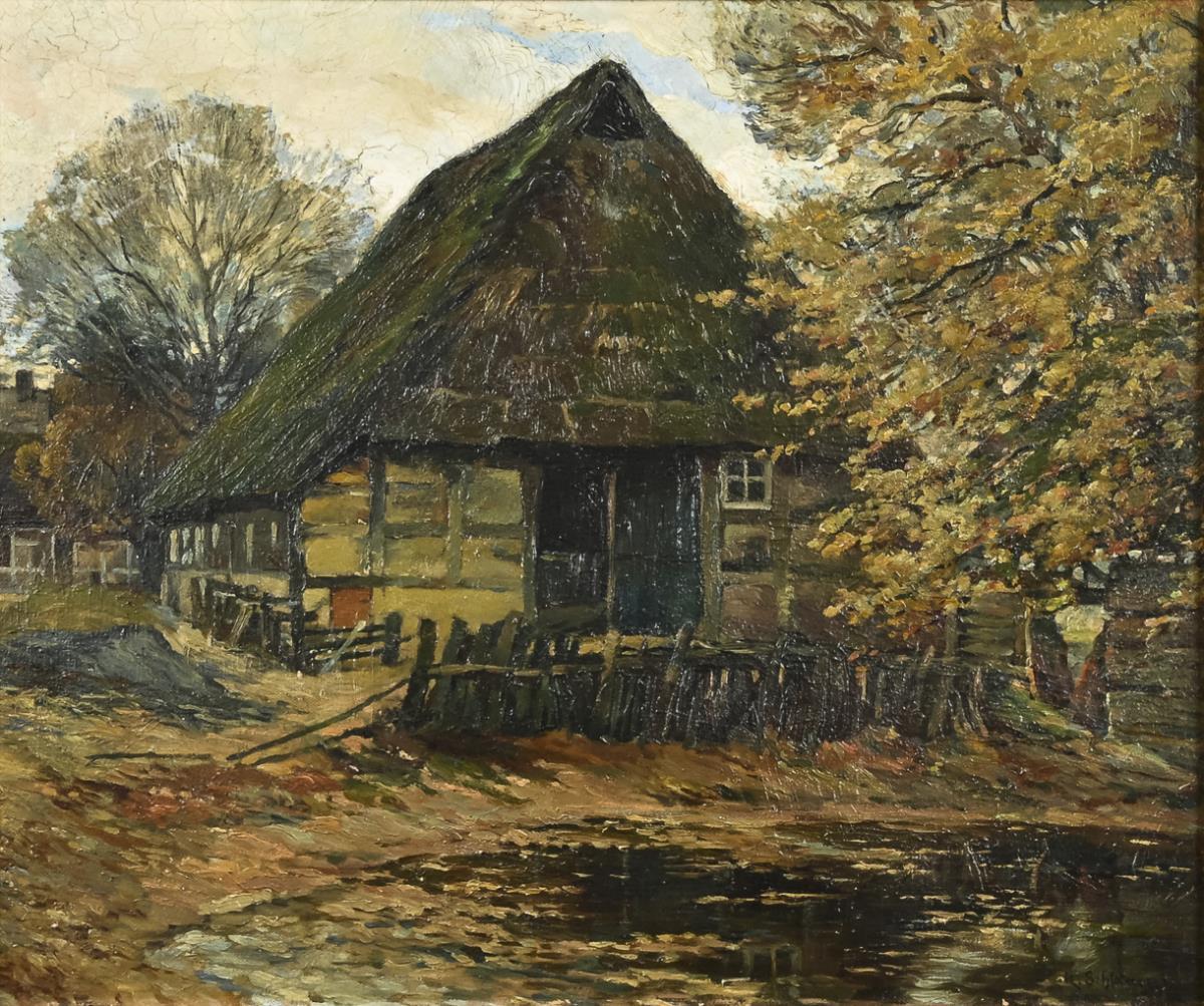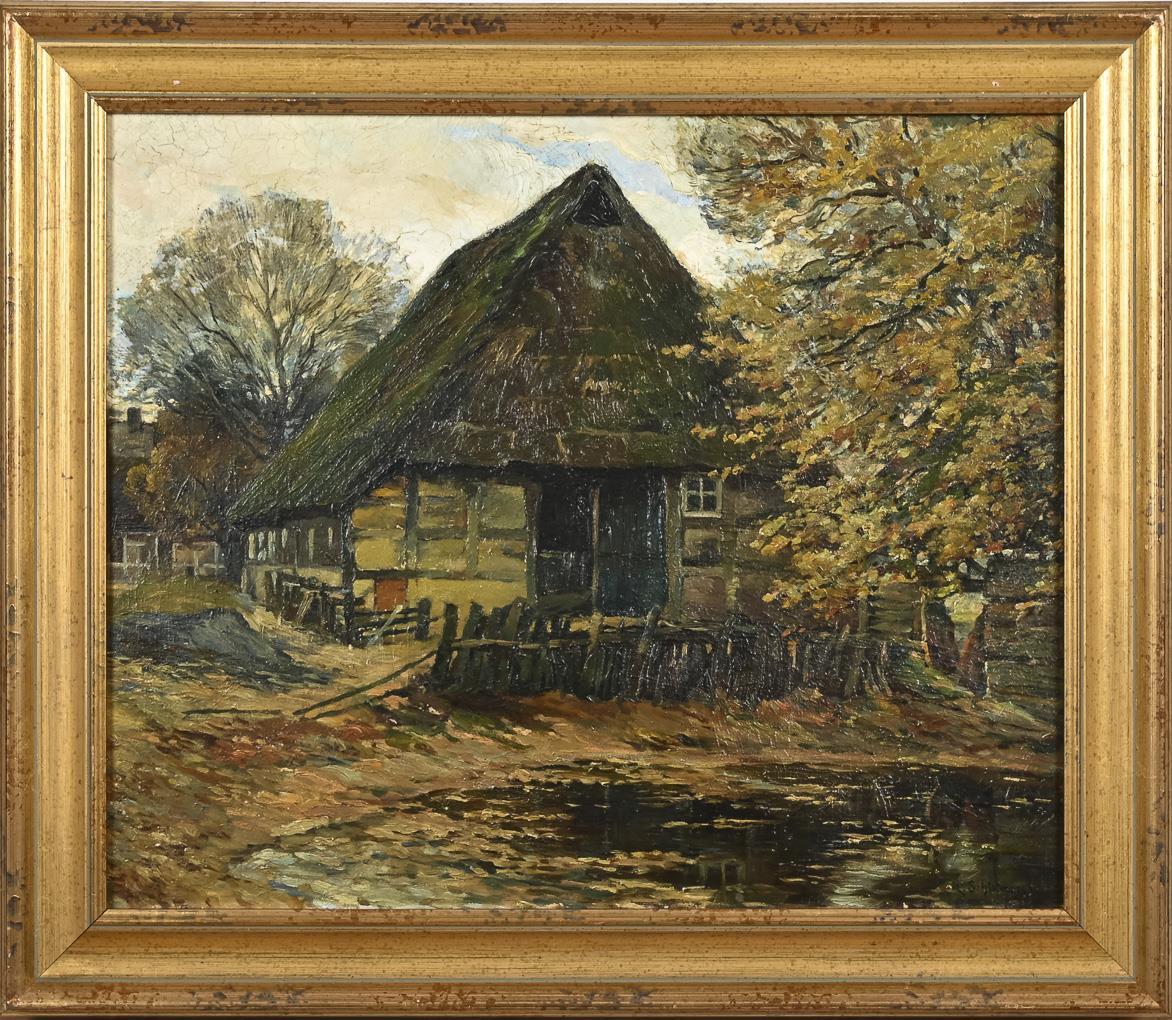 Reetgedecktes Bauernhaus mit einem Teich im Herbst. Leichte Altersspuren.