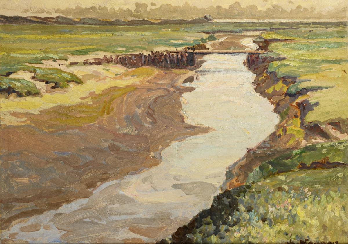Flusslauf in flacher Landschaft nahe der Küste am Horizont. Minimale Altersspuren.