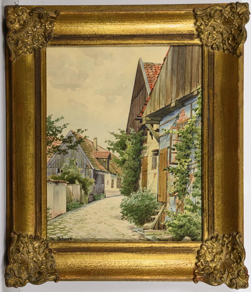 Qualitätvoll gemalte Straßenszene mit den Bauernhäusern unter bedecktem Himmel.
