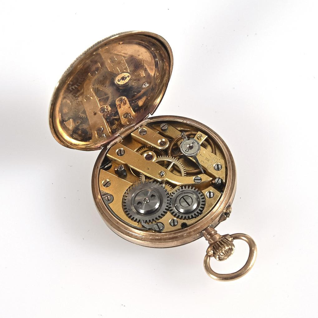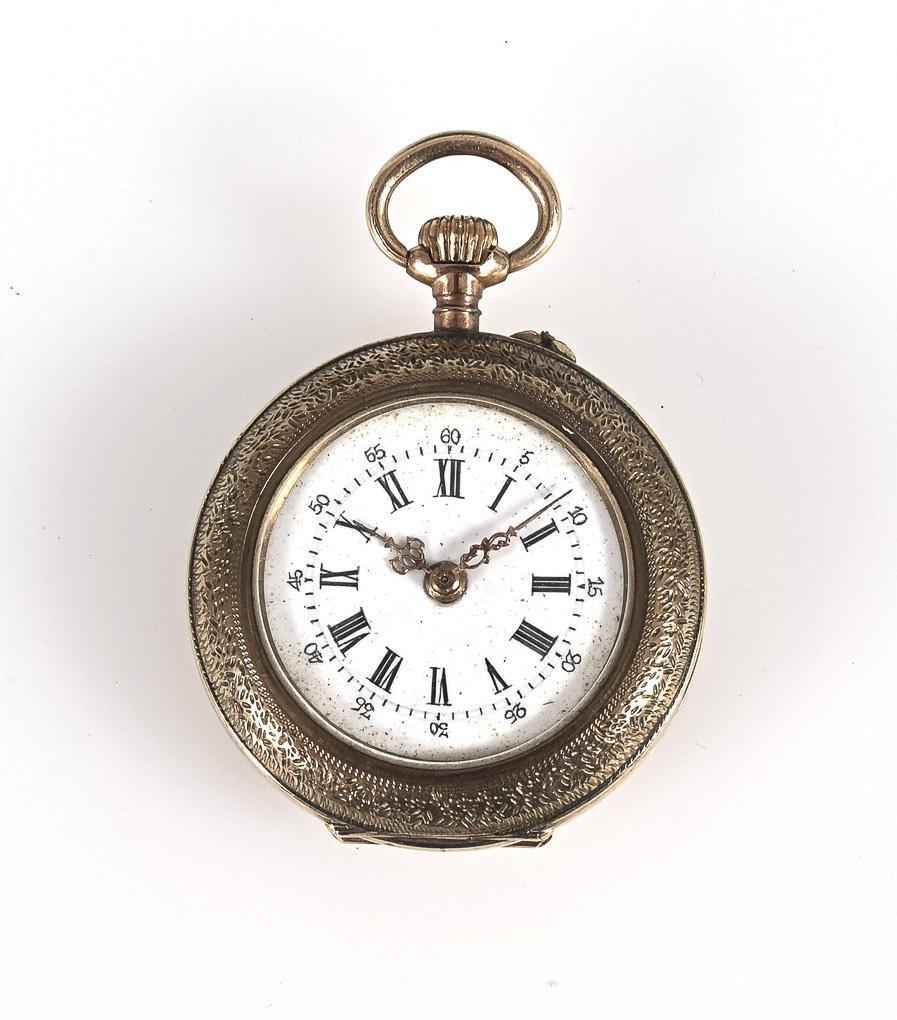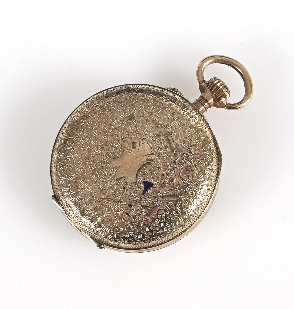 Ungemarktes Werk mit Zylinderhemmung, Reifenunruh, Steinen, Kronenaufzug, läuft. Weißes Emailzifferblatt mit römischen und arabischen Zahlen, Minutenkranz und Louis XV-Zeigern.