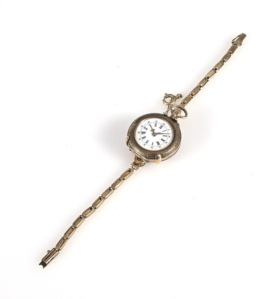 Lépine-Gehäuse mit leerer Reserve und Resten von farbig emaillierten Blumen. Filigranes Doublée-Zugarmband mit Zangenhalterung, L 17,5 cm. Partiell leicht gedellt, Email fehlend.