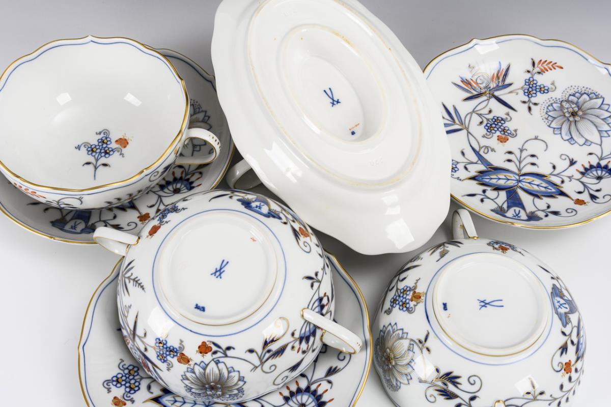 4 Zwiebelmuster-Suppentassen und 1 -Sauciere. Meissen.