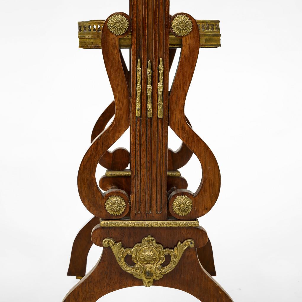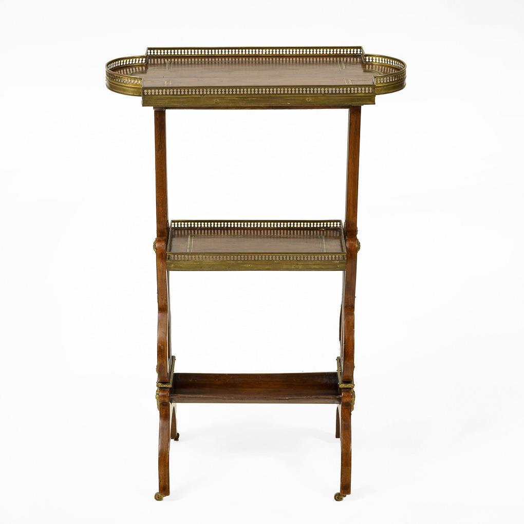 Rollbarer, zierlicher Serviertisch mit 3 Ablageflächen und lyrenähnlicher Seitenverstrebung, dekoriert mit Messingintarsien und -applikationen. Leichte Alters-/Gebrauchsspuren, restauriert.