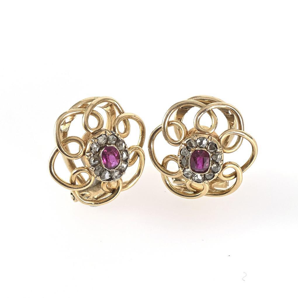 Ohrklipp-Paar mit Rubinen und Diamantrosen.