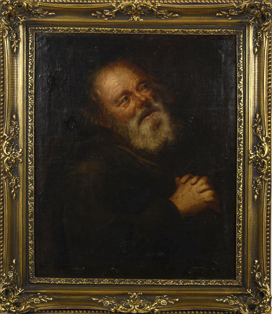 Alter Mann mit zum Gebet gefalteten Händen und nach oben gerichtetem Blick. Altersspuren.