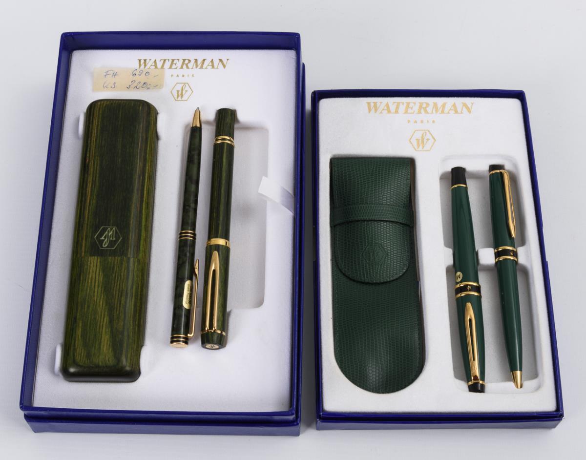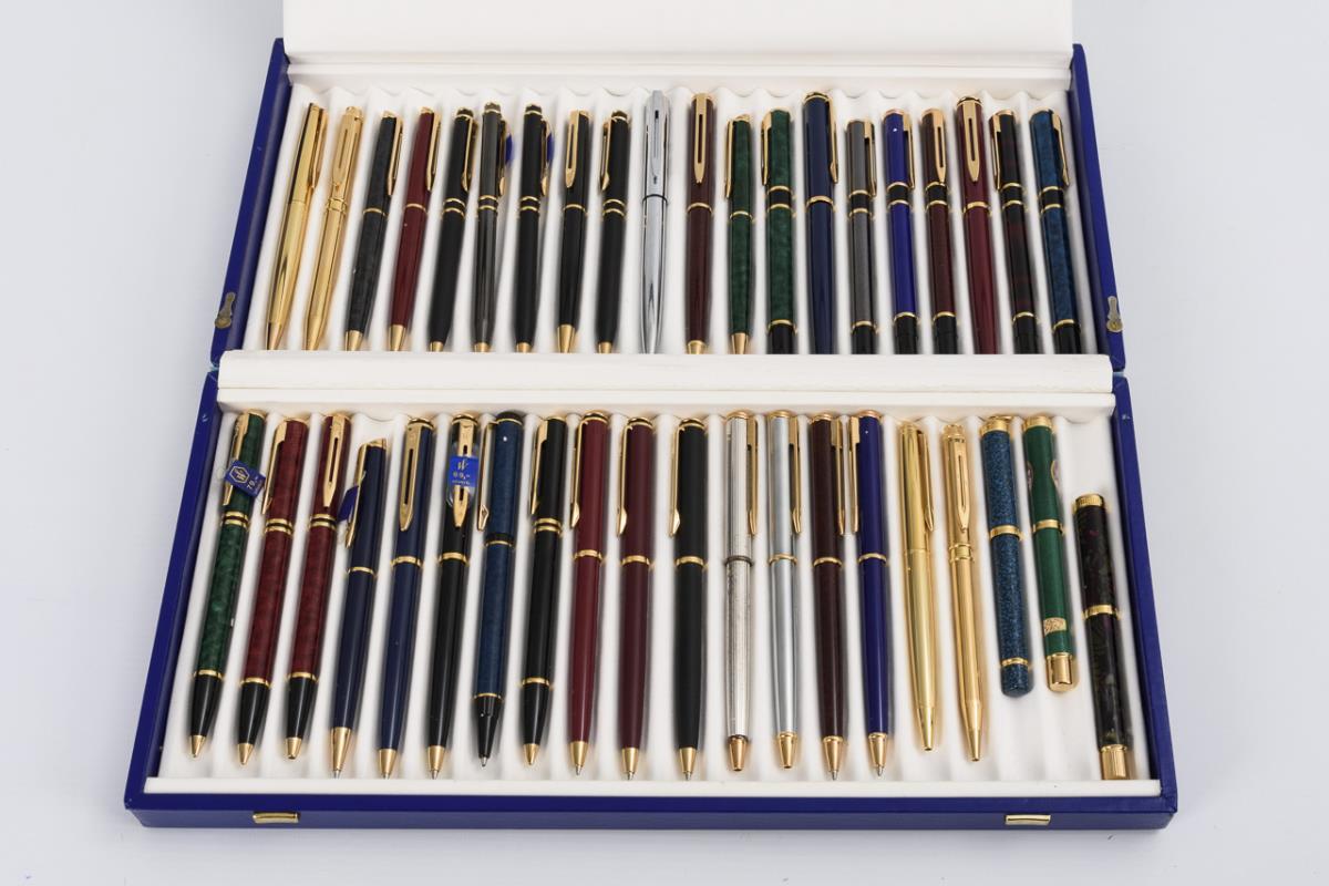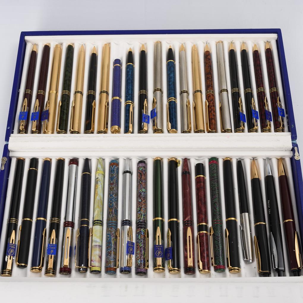 Zumeist gemarkte Schreibgeräte verschiedenster Art von Waterman, teils mit Preisetikett. Darunter 1 Parker-Kugelschreiber. 3 große Sammelschatullen und zahlreiche zumeist leere, je gemarkte Schatullen, häufig mit Gebrauchsanleitung, teils mit Patronen. Teims minimale Alters-/Gebrauchsspuren.