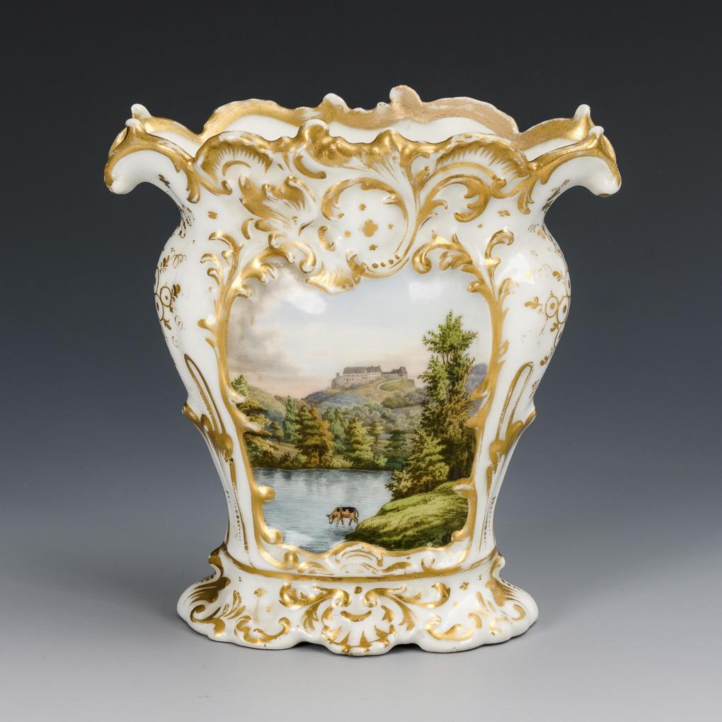 Geplattete Kratervase mit Rocaillerelief. Schauseitig eine Landschaftsansicht mit Blick auf die Wartburg bei Eisenach. Partieller Goldabrieb, 2 Randrestaurierungen.