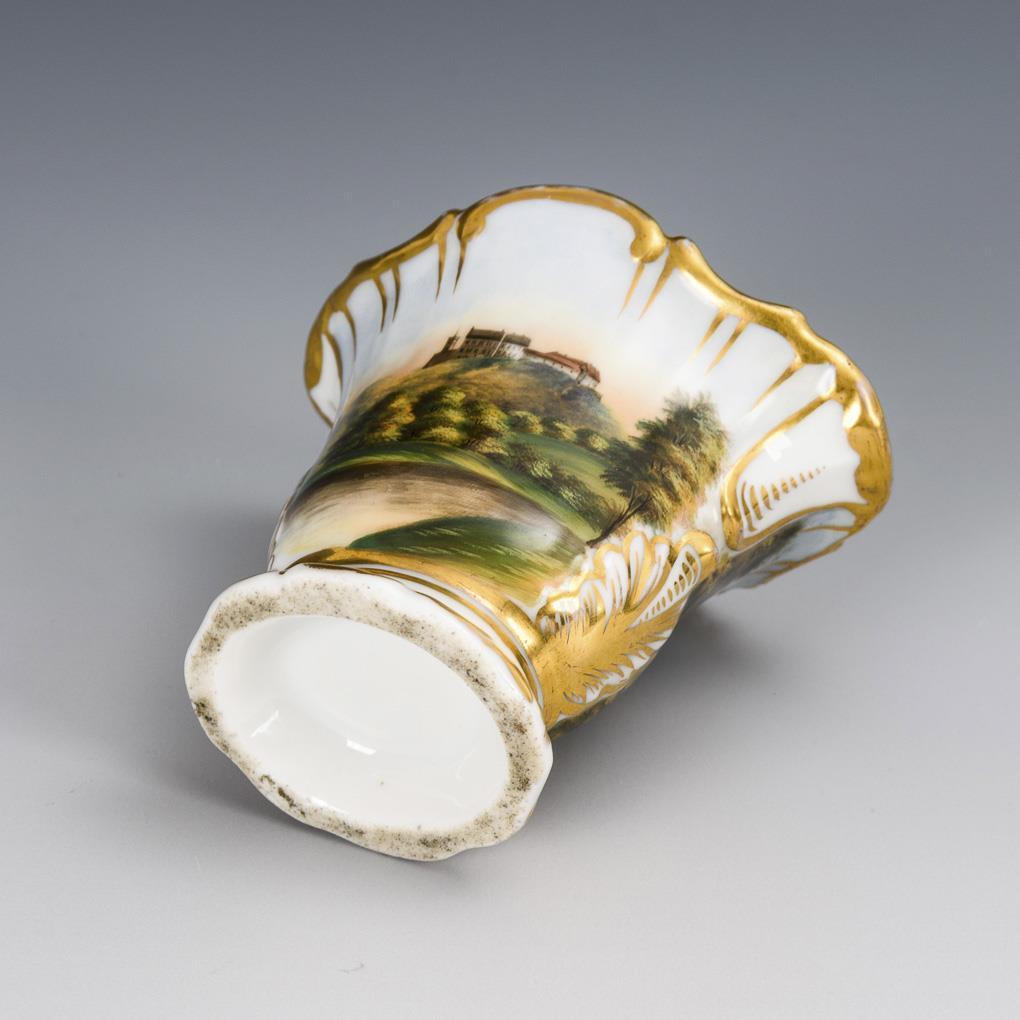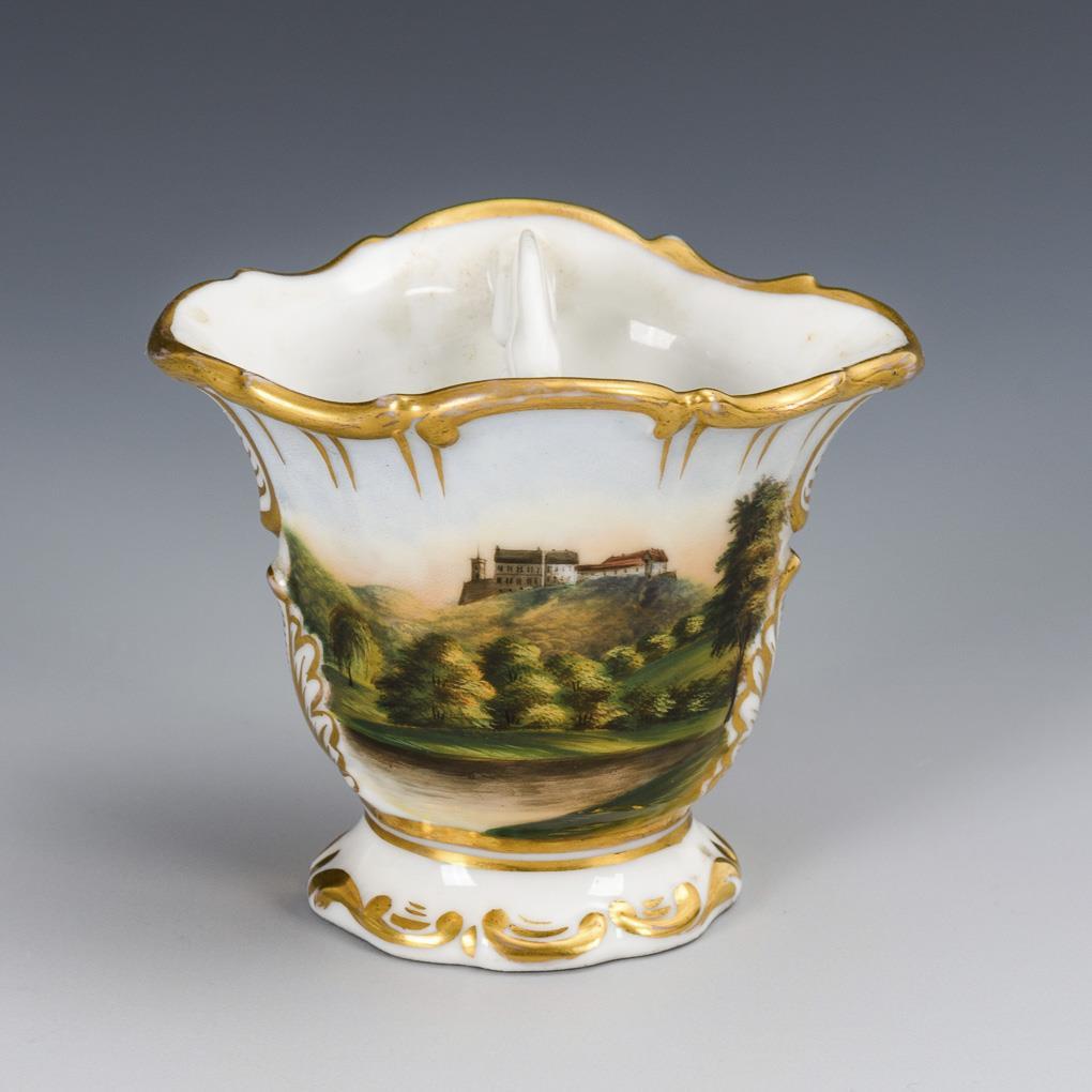 Passig-ovaler, gefußter Korpus mit goldstaffiertem Rocaillerelief. Beidseitig Ansichtenmalerei: 1x der Blick auf die Wartburg, 1x die Ansicht der Stadt Eisenach mit Blick auf die Wartburg. Minimaler Goldabrieb am Rand.