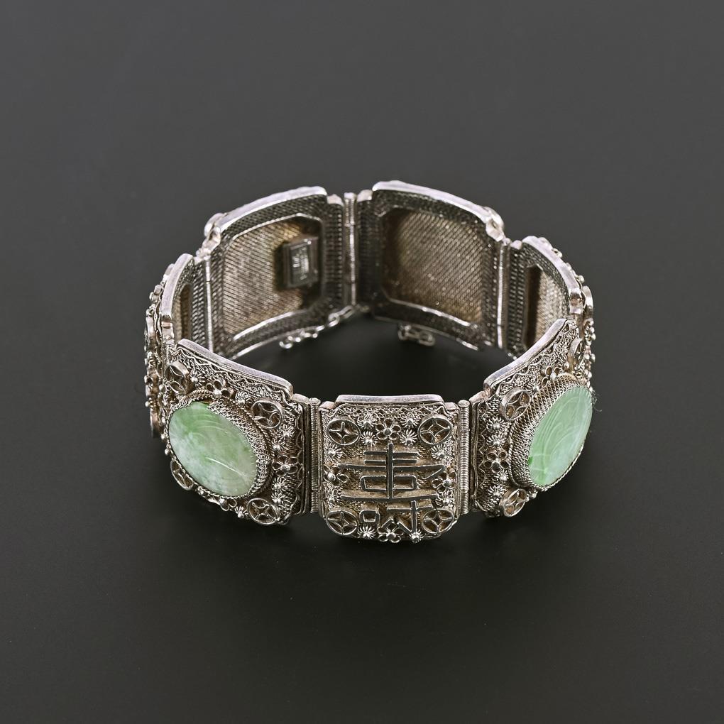 4 Fliligranglieder mit zargengefassten Jadescheiben und 3 Glieder mit Schriftzeichen. Kastenschloss mit Sicherheitskette.