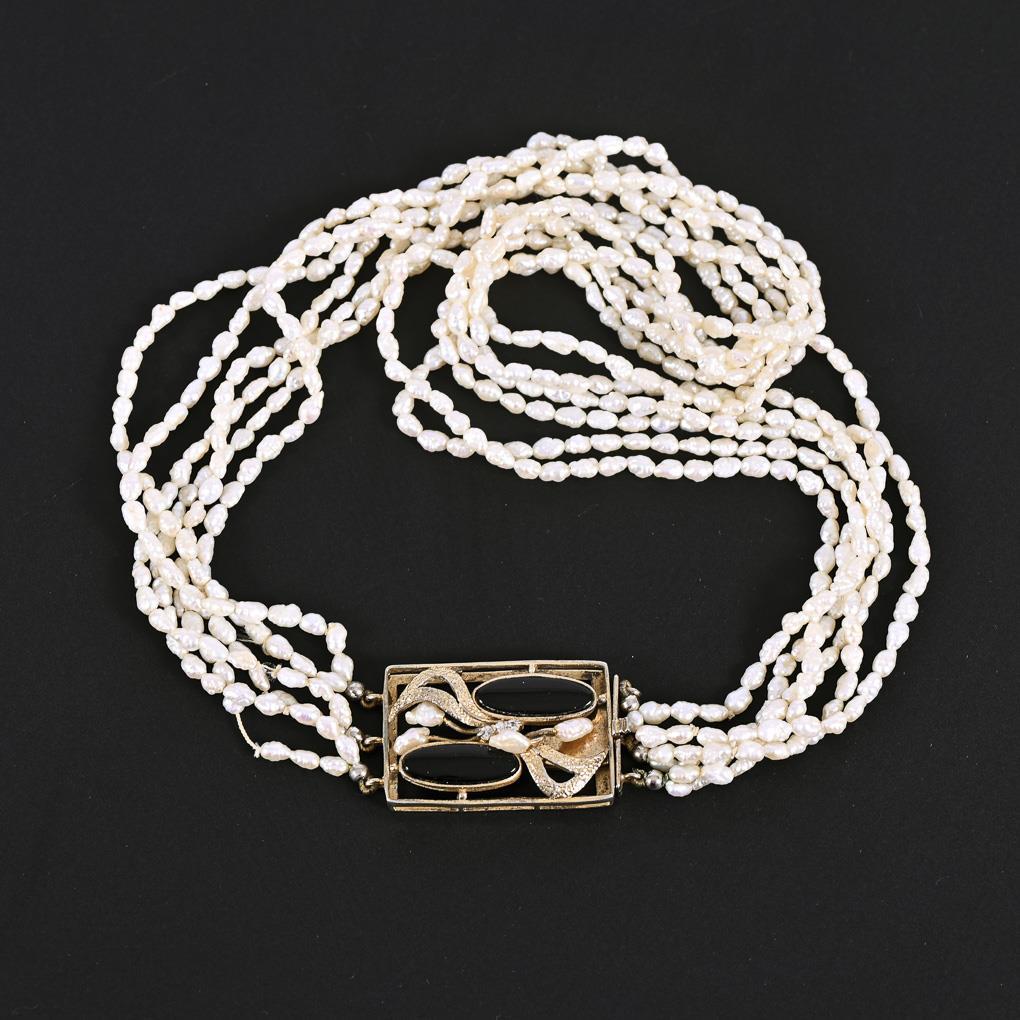 Schnürketten mit kleinen Zuchtperlen, an Zierschließe mit schwarzen Einlagen.