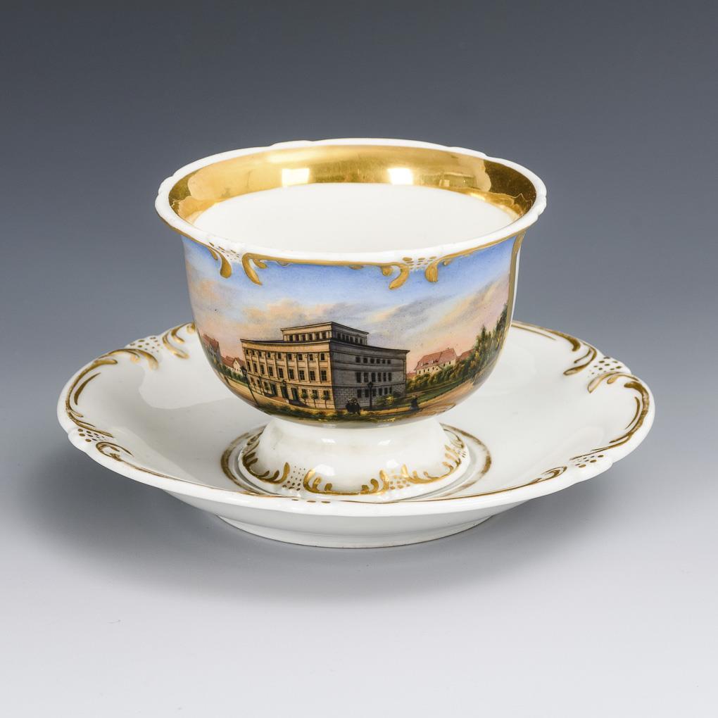 Gefußte Glockentasse mit Ohrenhenkel und rocaillereliefiertem Rand. Schauseitig eine goldgerahmte Rechteckkartusche mit der Ansicht des 1832-1834 erbauten Universitätsgebäudes in Halle.