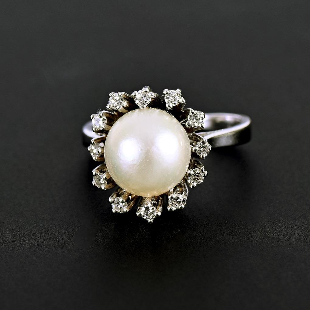 Weißgold 585 gestempelt. Ringgröße 55. Perle Ø 10 mm. Brillanten gesamt 0,33 ct. 5,7 g.
