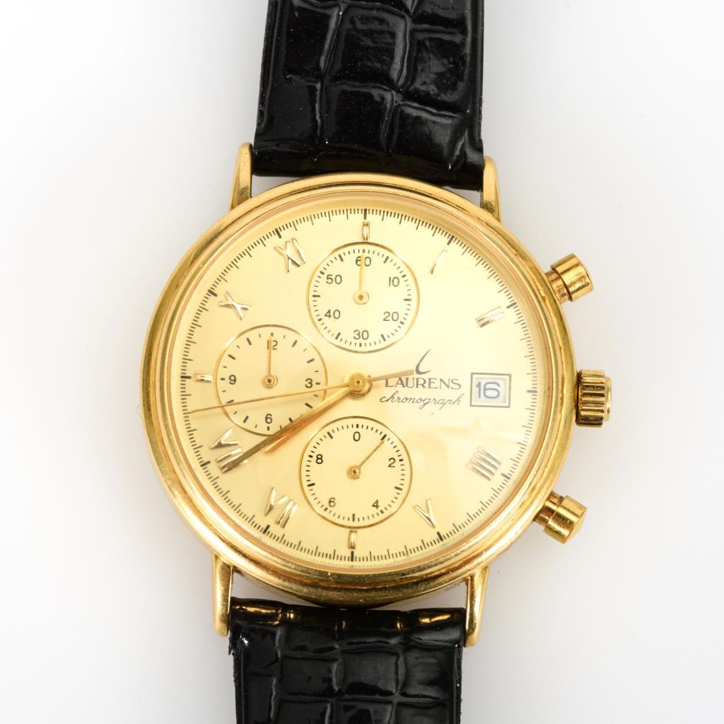 Referenznr.: 17447.Quarzwerk mit Stellkrone.Goldfarbenes Zifferblatt mit römischen Zahlen, Minuterie, Hilfszifferblätter für kleine Sekunde, Stunden, Minuten und Datum, Stoppuhrfunktion, 2 seitliche Drücker.Herstellerprägung Anzeige: "Laurens chronographe".
