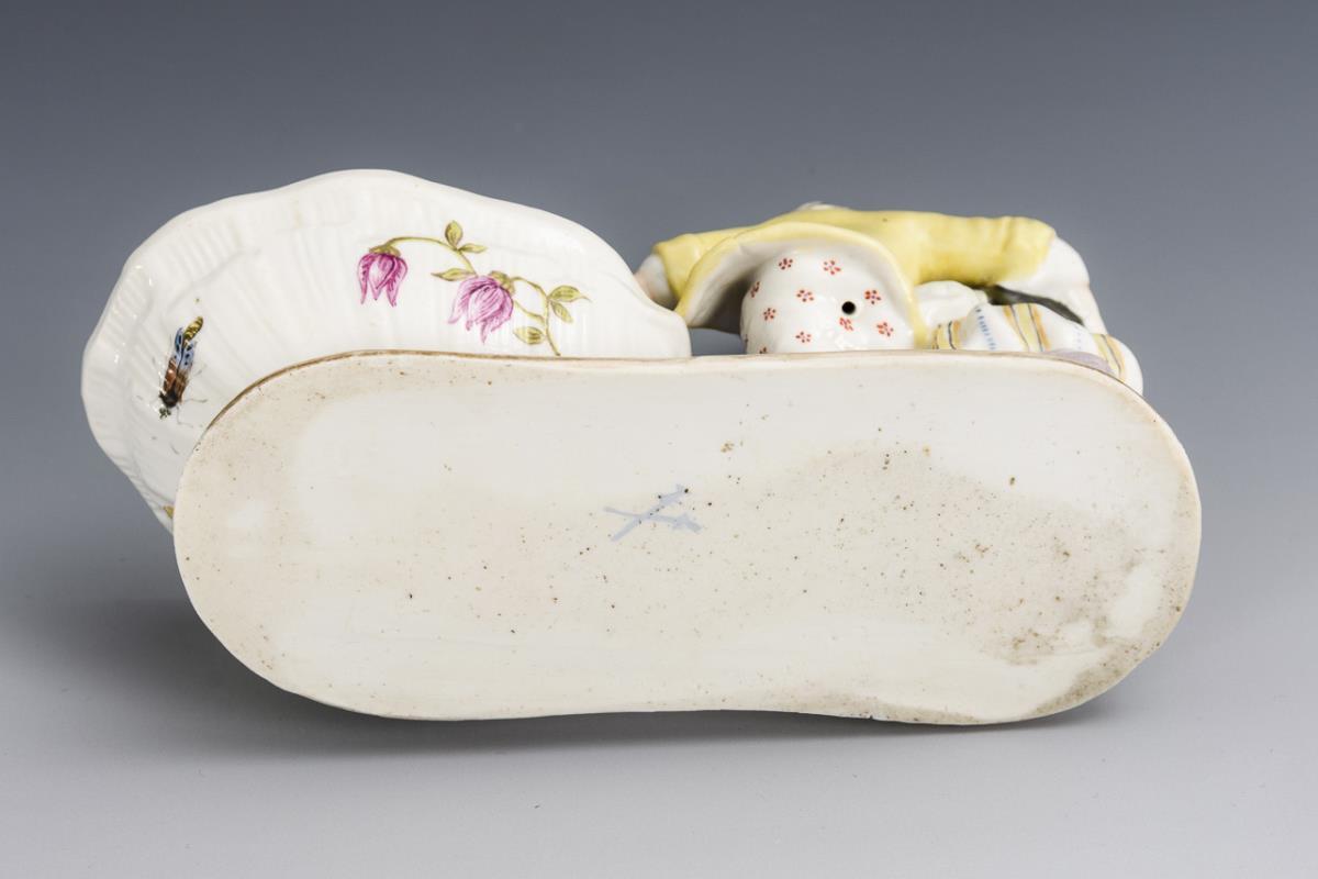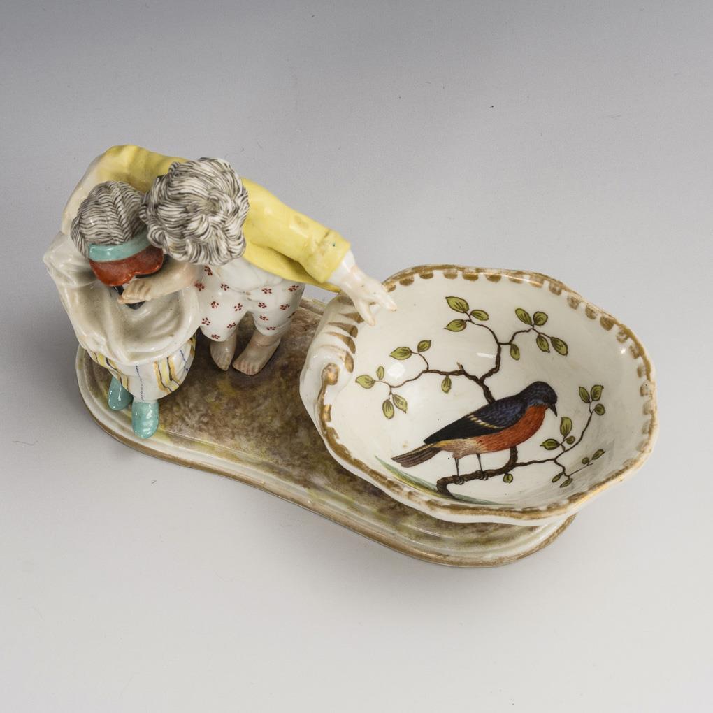 An einer Muschelschale mit Vogelmalerei stehendes Kinderpaar. Gold berieben, Hals des Mädchens restauriert.