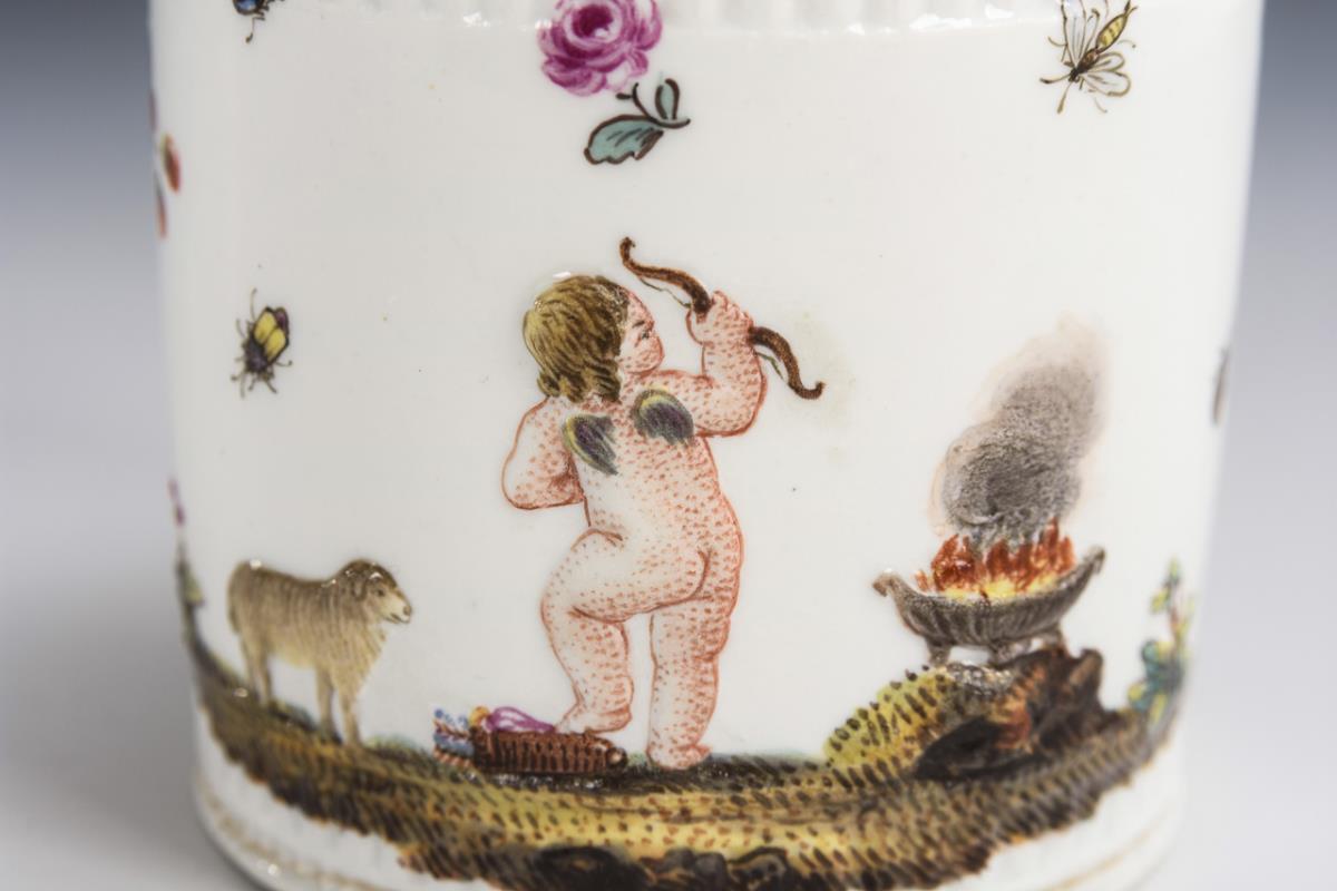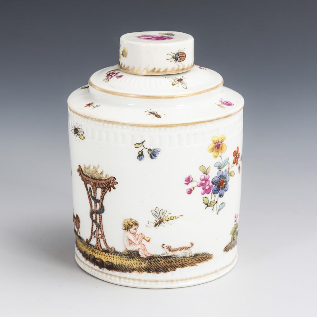 Zylinderdose mit zwei polychrom bemalten Biskuit-Reliefdarstellungen: 1x Putto mit Lamm an einer Feuerschale, 1x unter einer Feuerschale mit Schlange sitzender, eine Schalmei spielender Putto mit Hund. Deckel restauriert, Gold etwas berieben.