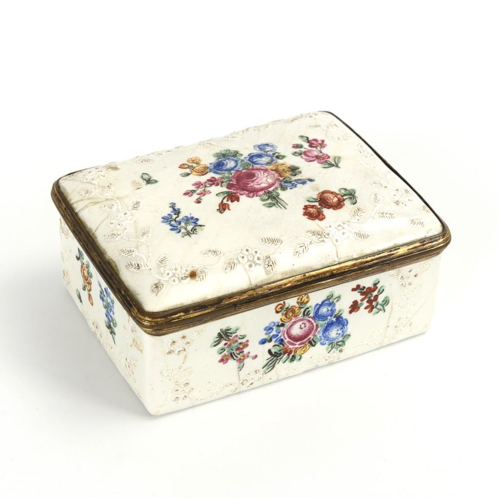 Kupferemail mit weißem Fond und Email de Saxe, gemalte Blumen, vergoldete Kupfermontierung. 4 x 8,5 x 6,5 cm.