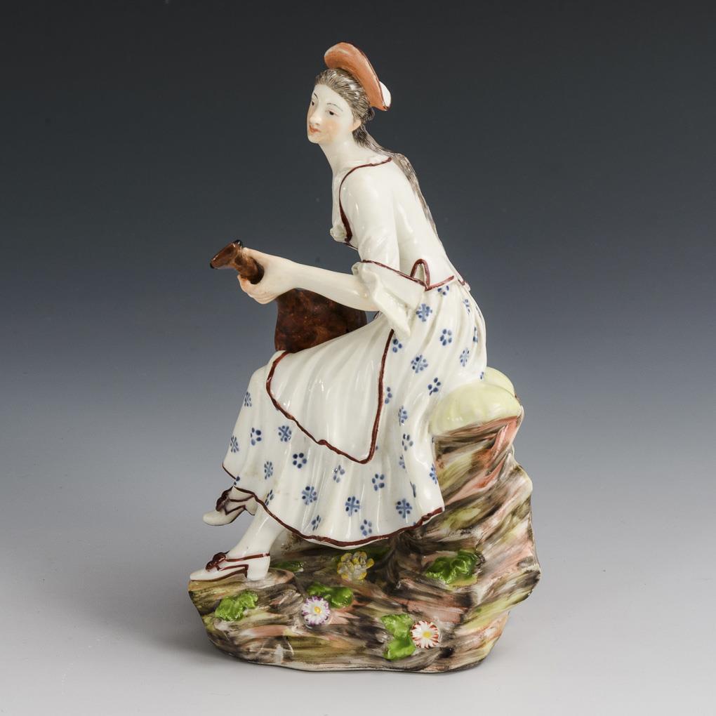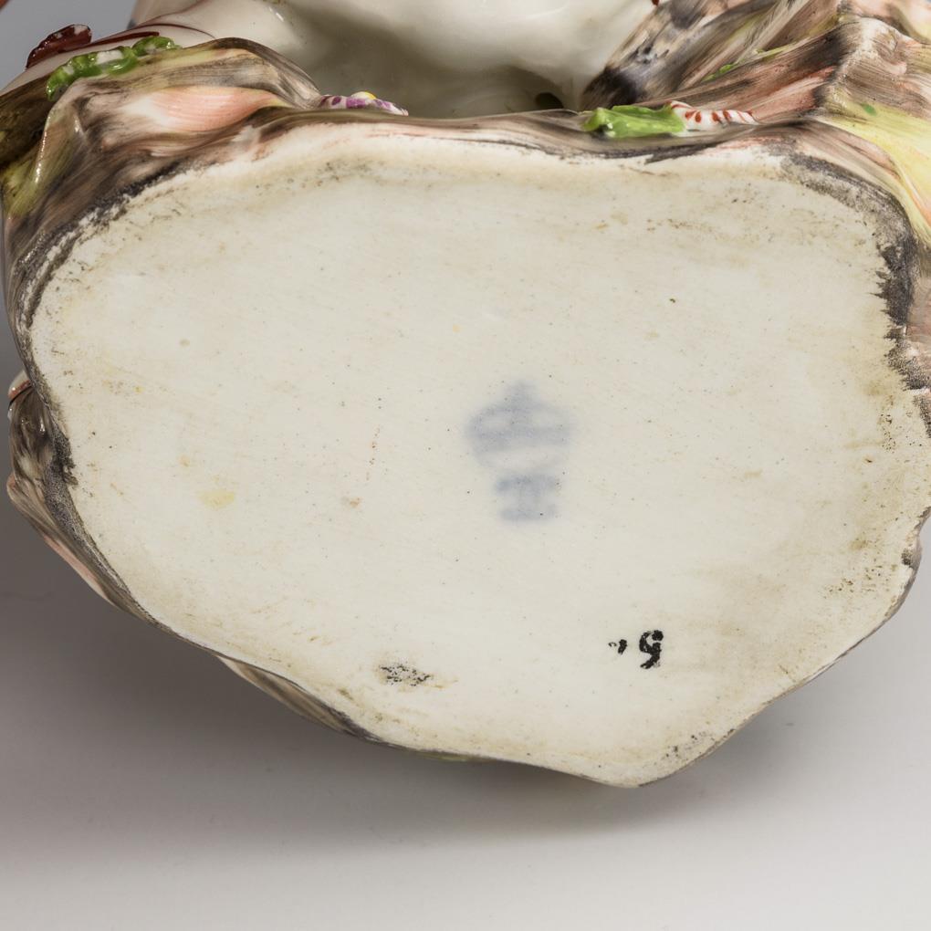 Auf einem Felssockel sitzende, eine Laute spielende junge Dame mit Lamm. Brandriss in den Saiten, linker Schuh, Lautenhals, linke Hand und linke Ärmelrüsche restauriert.