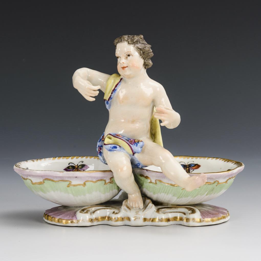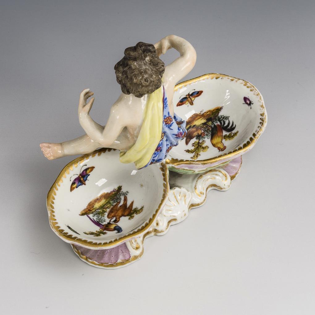 Zwischen zwei Muschelschalen mit Vogelmalerei sitzender Putto. Linke Fußspitze restauriert, Gold partiell berieben.