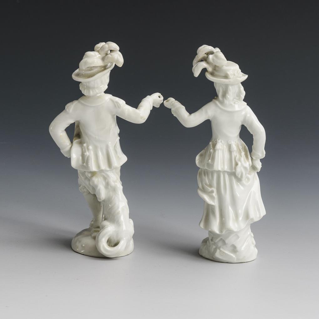 1x stehender Kavalier, der von einem Hündchen gebissen wird. / 1x stehende Rokokodame mit Federhut. Kopf des Kavaliers und Hut der Dame restauriert.