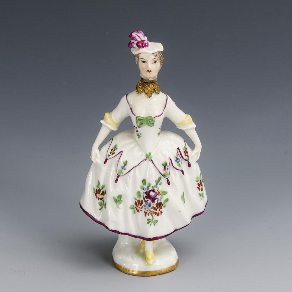 Kleine Figur einer tanzenden Rokokodame mit messingmontiertem Hals, der Kopf der Dame als Flakonstopfen gearbeitet.