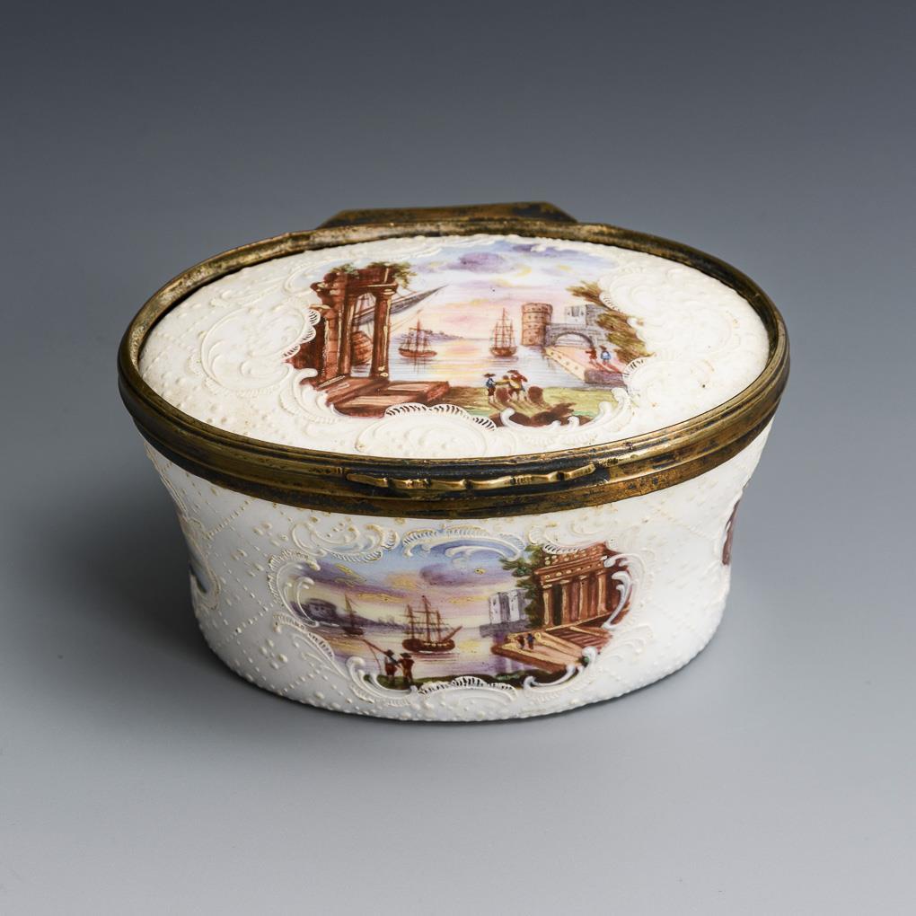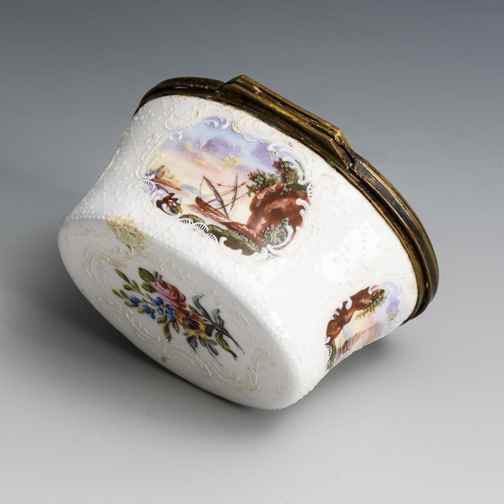 Ovale Tabatiere mit gewölbtem Scharnierdeckel. Allseits, auch auf dem Boden und dem Deckel Reliefornament mit Rocaillenkartuschen, darin gemalte Szenen; auf dem Boden und im Deckel Blumen. Deckel aus der Montierung gelöst, kleine Retusche an der Bodenkante, sonst kaum Alters-/Gebrauchsspuren.
