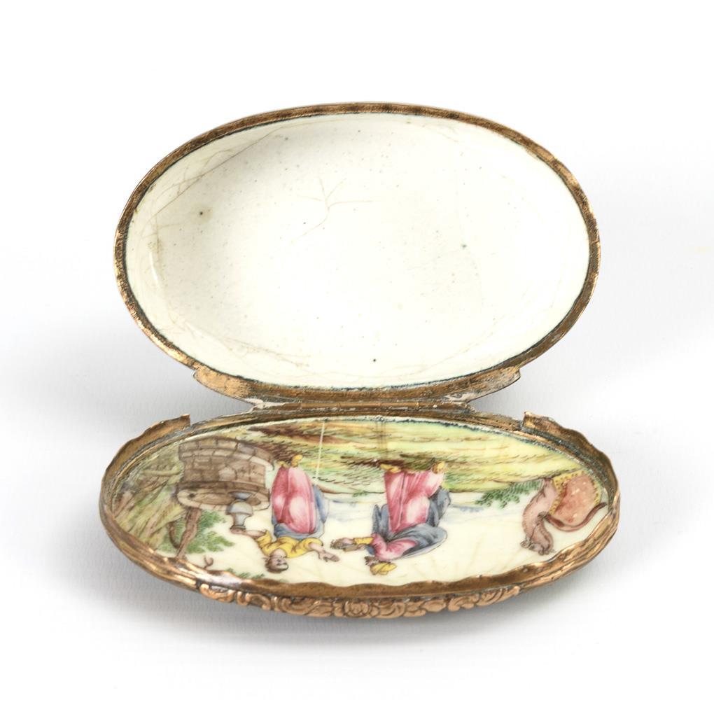 Ovale Dose allseits, auch auf dem Boden sowie auf und im Scharnierdeckel bemalt. Z.B. ein Engel weist Hagar und Ismael die Quelle, Elieser und Rebekka usw. Krakeliert, innen stärker.