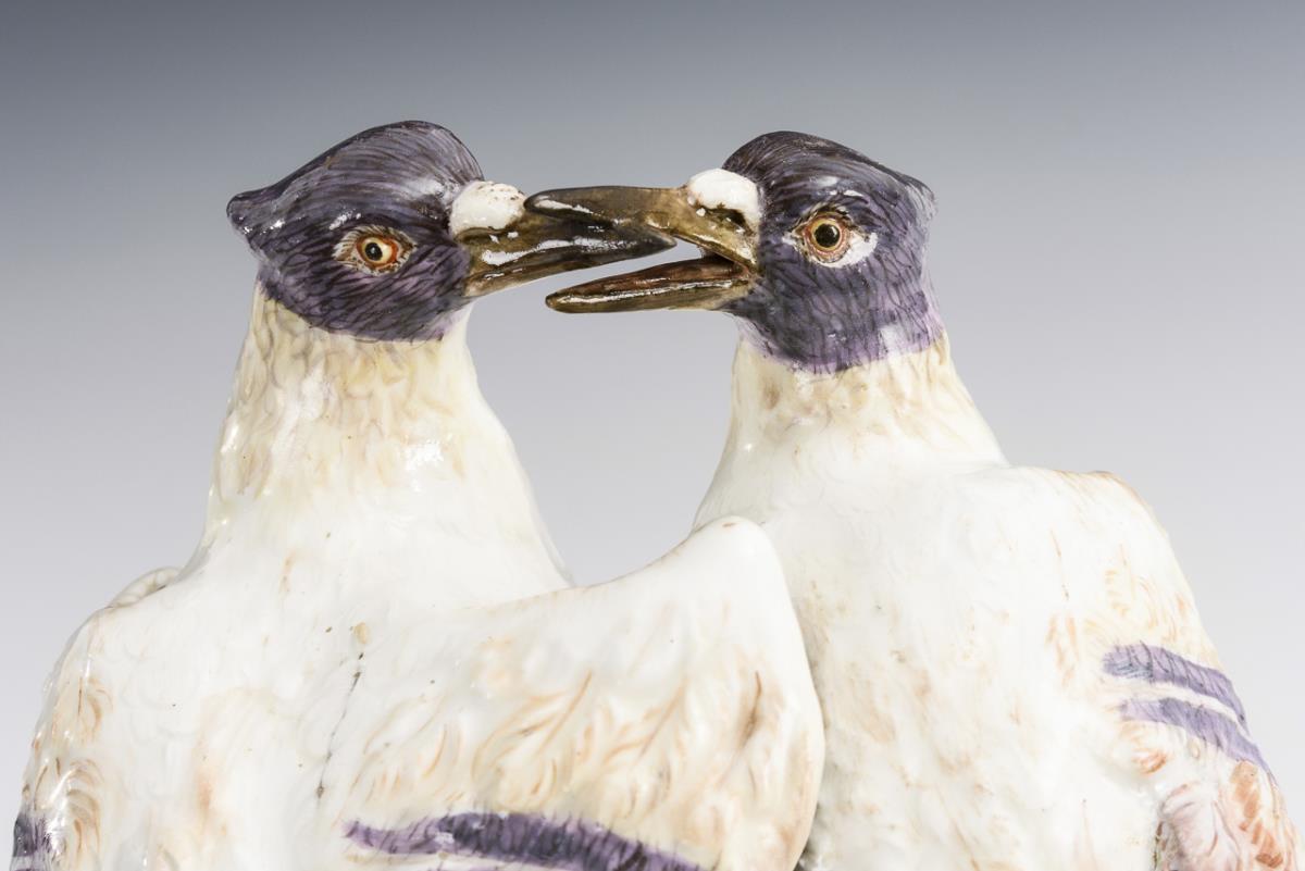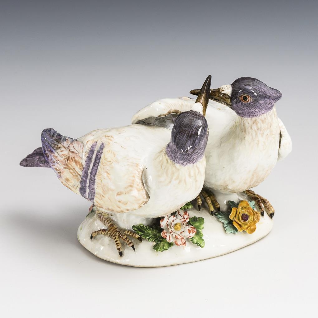 Auf einem blütenbelegten Sockel sitzendes, schnäbelndes Taubenpärchen. Schnäbel, einige Blüten, 1 Flügelspitze restauriert, beide Schwänze mit Restaurierung, 1 Blatt bestoßen.