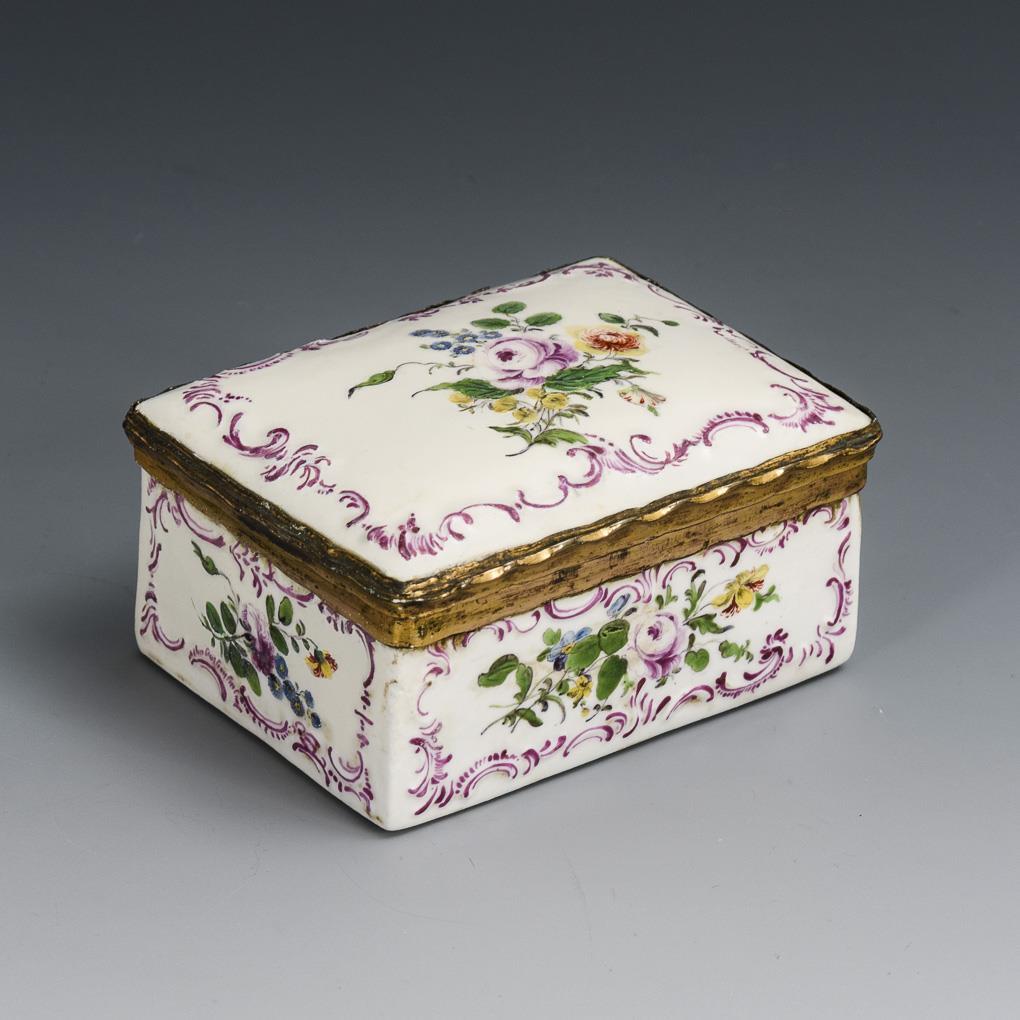Rechteckige Dose mit metallmontiertem Scharnierdeckel, purpurfarben staffiertem Rocaillerelief und allseitigen Blumenbuketts. Im Deckel eine purpurfarben gemalte Küstenlandschaft mit Bergen, Segelbooten, Architektur und Personenstaffage. Deckel restauriert.