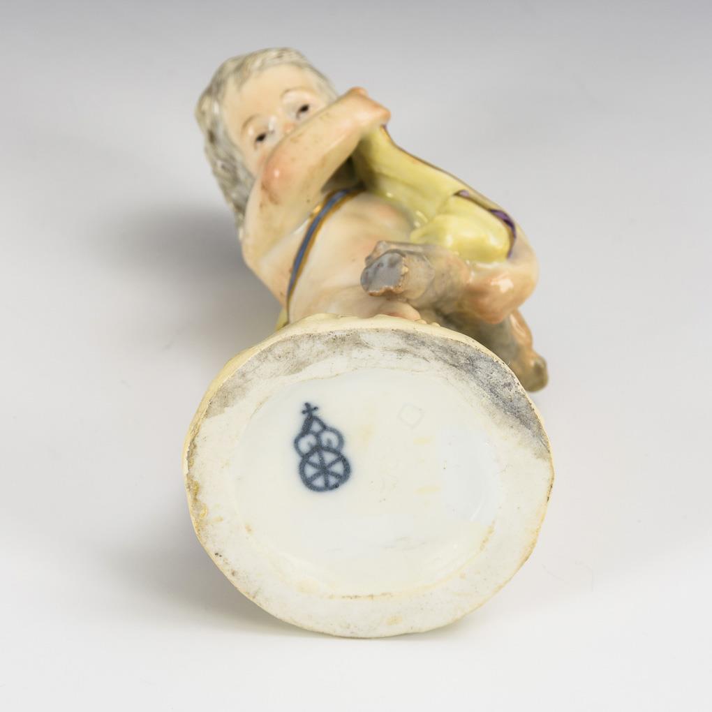 Auf einem Natursockel an einer Schale stehender Putto mit Mantel und Brennholz. Sockel, linkes Bein, Holzenden und Teil des Mantels restauriert.