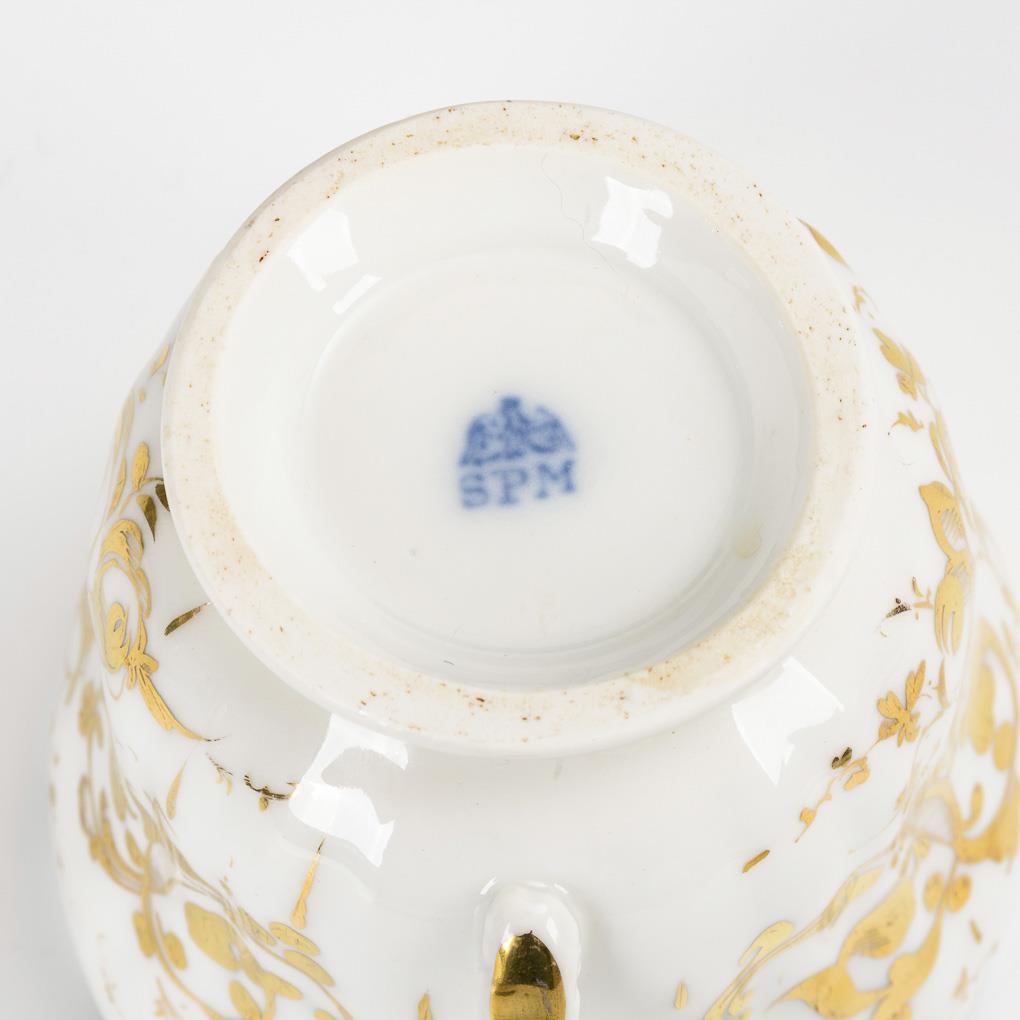 Gefußte, passige Glockentasse mit Ohrenhenkel. Schauseitig eine rocaillereliefgerahmte Kartusche mit der Ansicht des Rheins mit Burgruinen auf den Felsen, verso vegetabile Goldmalerei.