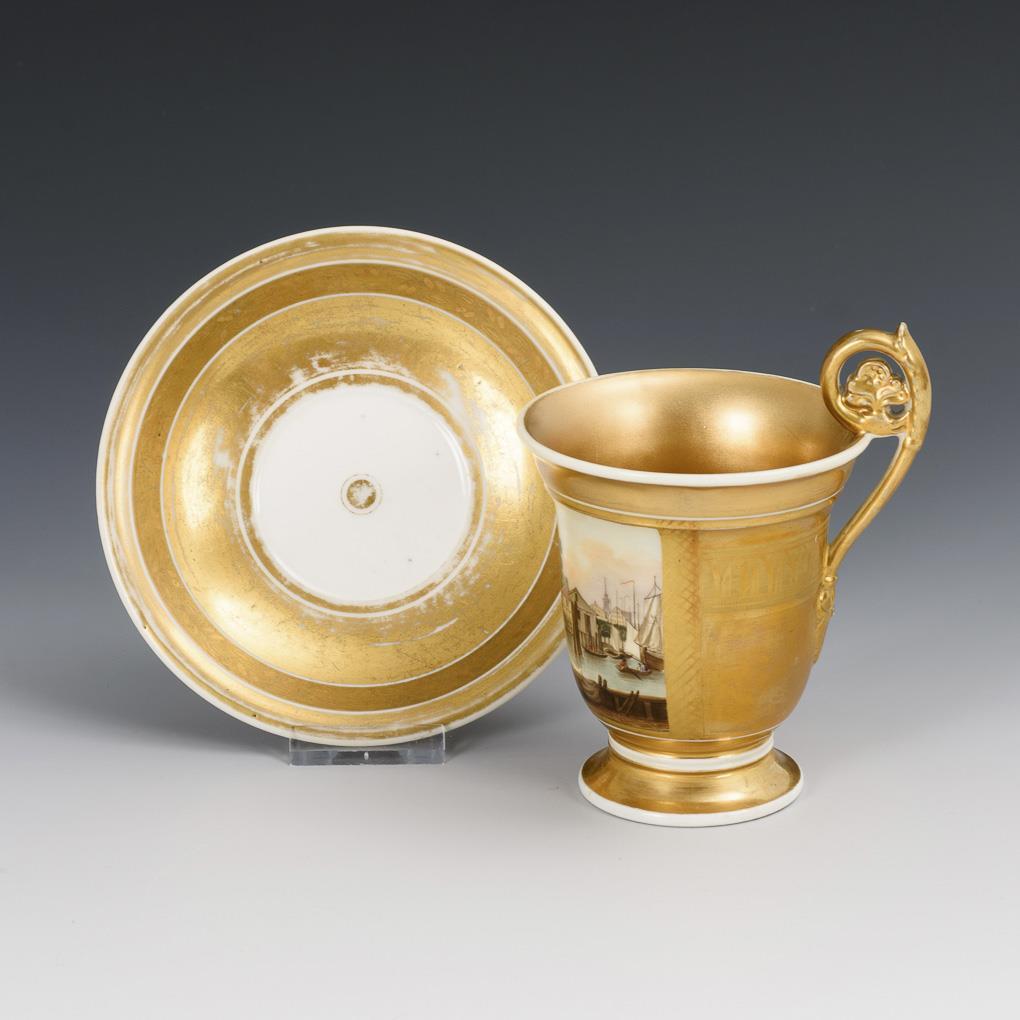 Gefußte Glockentasse mit Palmettenhenkel. Goldfond, schauseitig eine Rechteckkartusche mit der bezeichneten Ansicht des ehemaligen Baumhauses im Hamburger Hafen, einem 1662 erbauten Zoll-, Börsen-, Konzert- und Wirtshauses in der Hamburger Neustadt. Es wurde 1857 abgerissen. Restaurierter Wandungshaarriss, minimaler Goldabrieb.