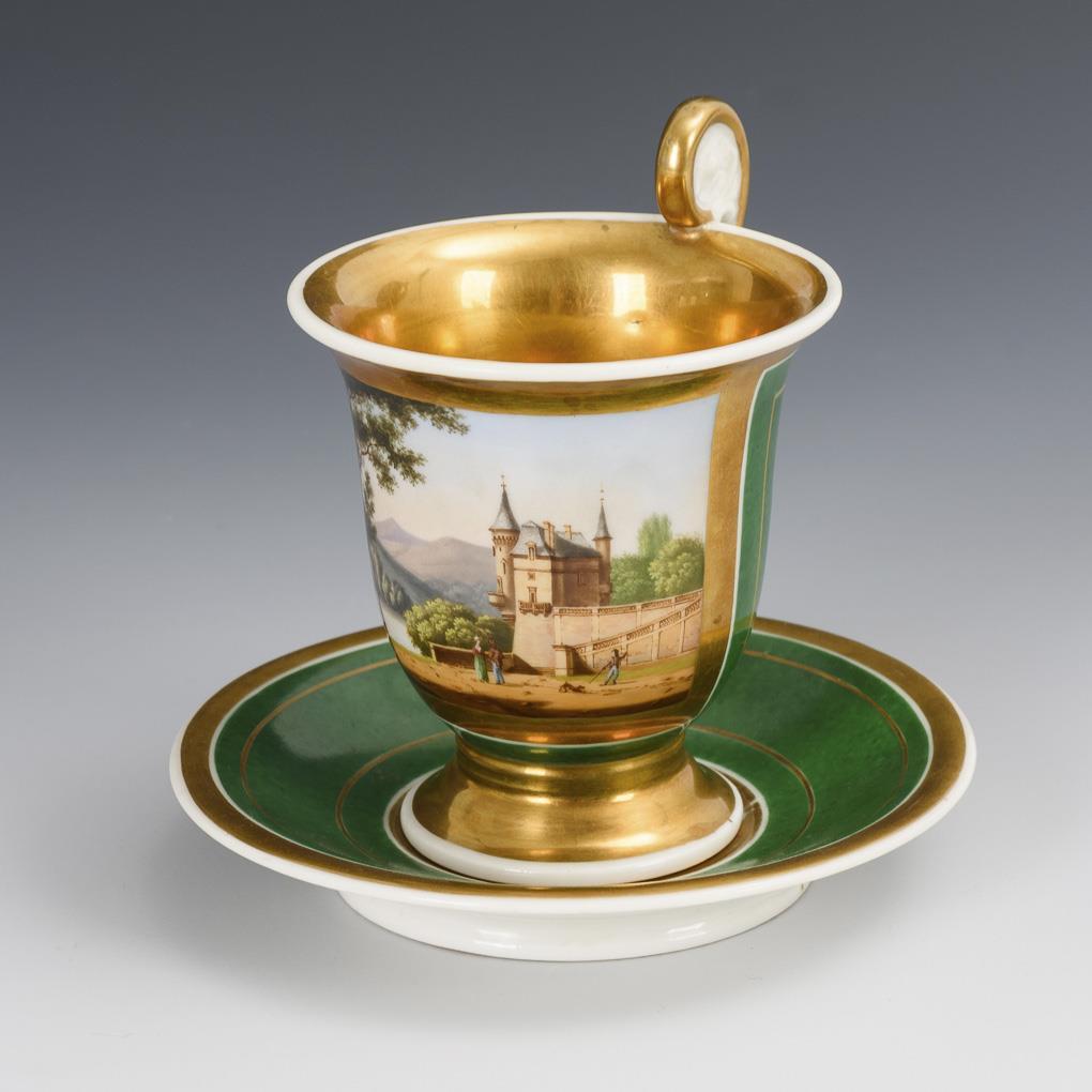 Gefußte Glockentasse mit Rosettenhenkel. Grüner Fond, schauseitig eine goldgerahmte Rechteckkartusche mit der Darstellung einer Flusslandschaft mit Burg und Personenstaffage.