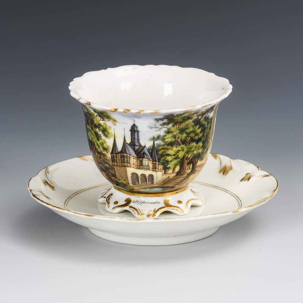 Gefußte Glockentasse mit Rocaillehenkel. Schauseitig eine goldgerahmte Rechteckkartusche mit der bezeichneten Ansicht der Popperöder Quelle mit Brunnenhaus bei Mühlhausen. Gold berieben, Wandungshaarriss, 2 Randbestoßungen an der Tasse.