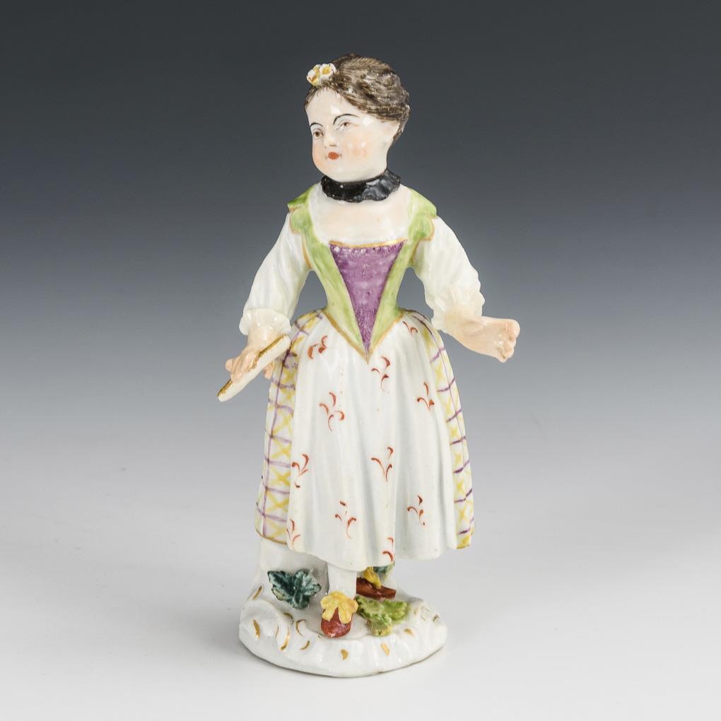 Auf einem Rocaille- und Natursockel stehendes Mädchen mit Fächer. 1 Blatt bestoßen, Fächer bestoßen und restauriert, und beide Hände restauriert.