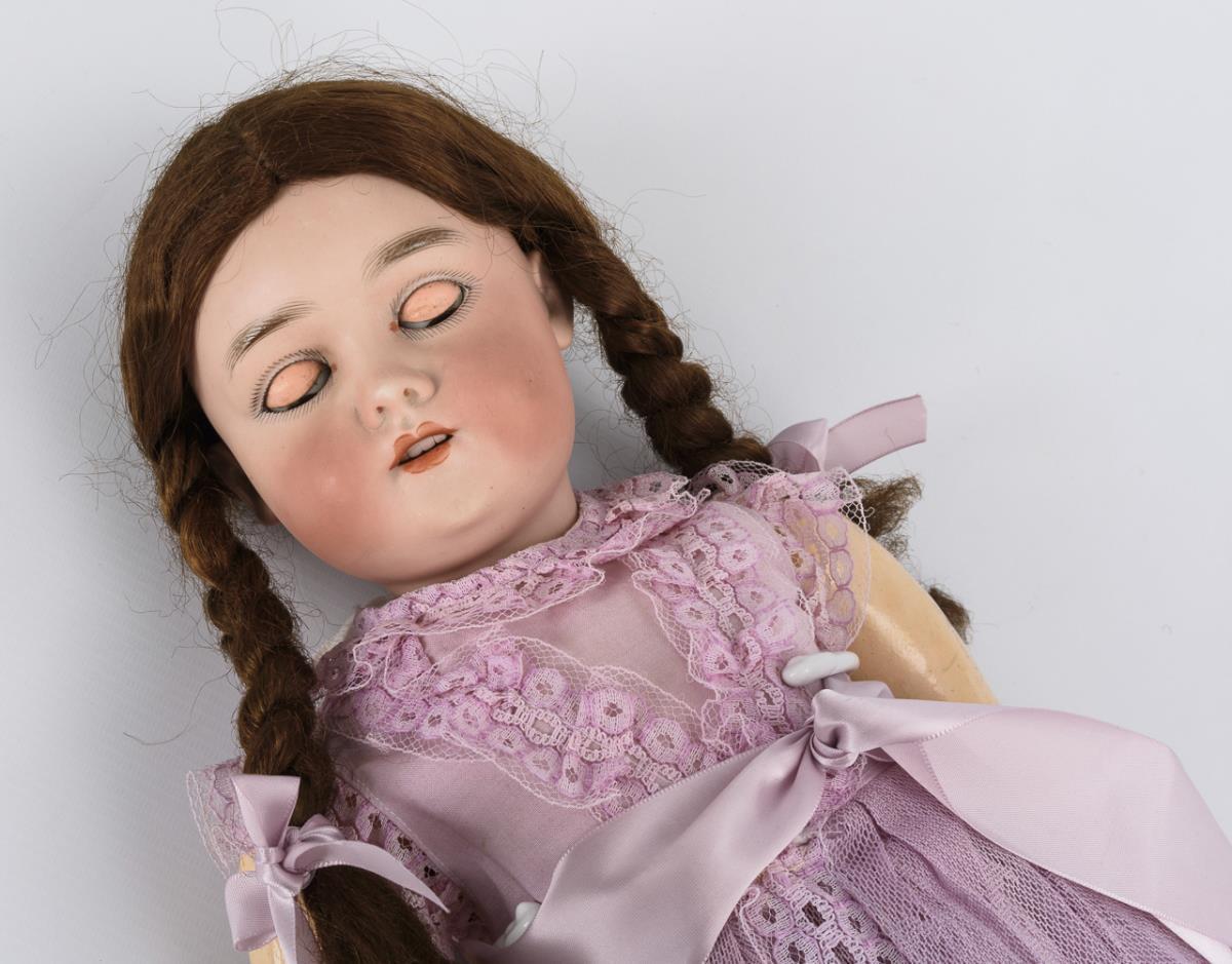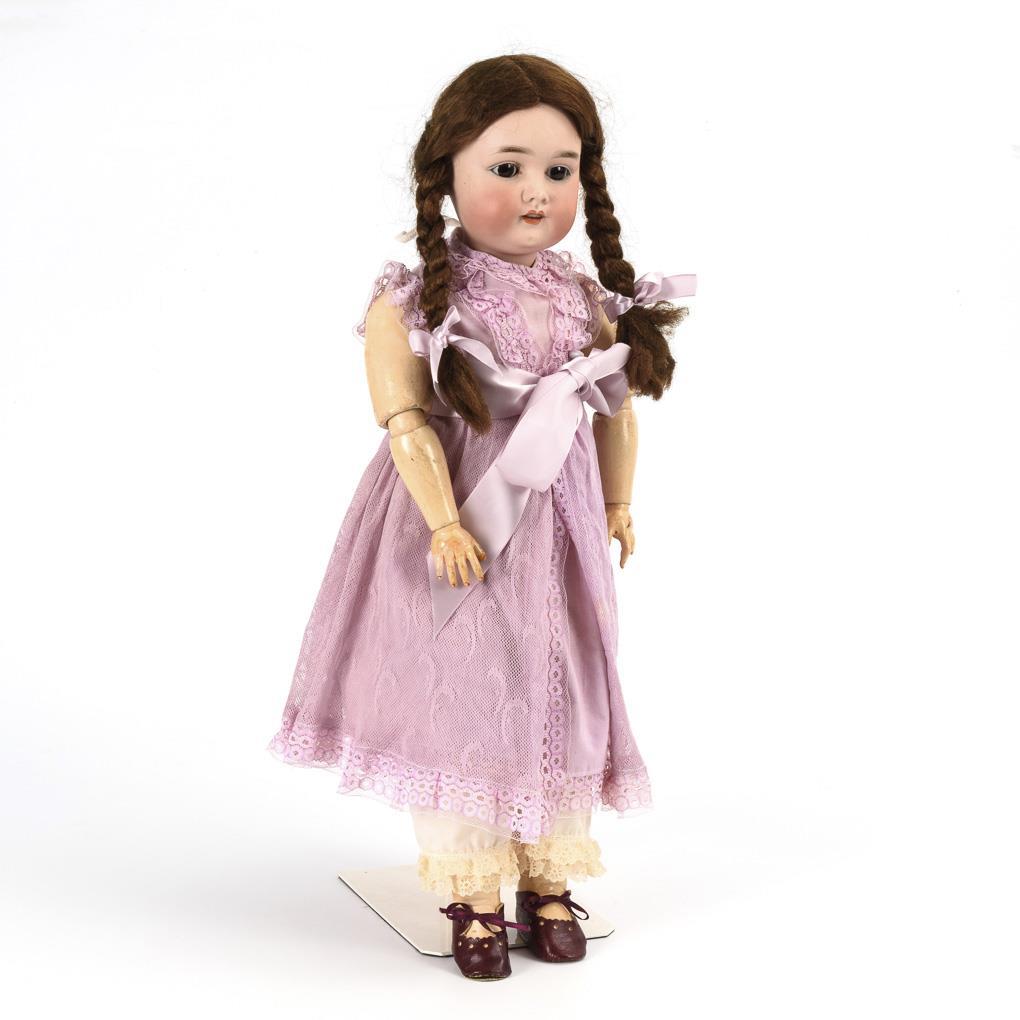Kurbelkopf, braune Schlafaugen, modellierte Augenbrauen, braune Kunsthaarperücke mit Zöpfen. 15-teiliger Gliederkörper. Rosa Kleid, weinrote Lederschuhe. Kopf durchleuchtet: ohne Defekte, lediglich leichter Perückenpull. Körper bespielt, teils übermalt, 1 Finger repariert.