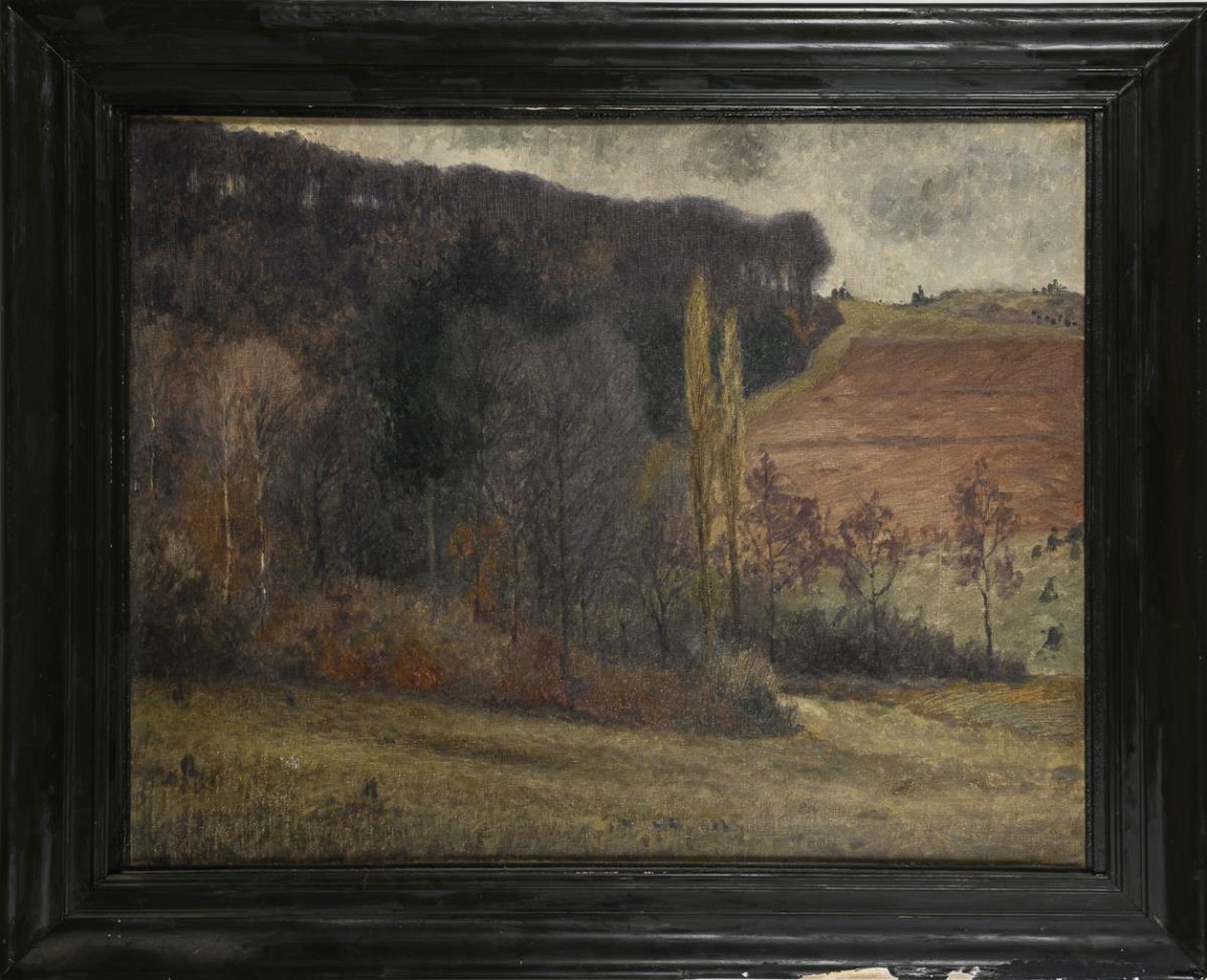 Herbsttonig gestimmte Ansicht des sanften Tales mit dichtem Wald und gepflügtem Acker. Zwei kleine restaurierte Stellen.