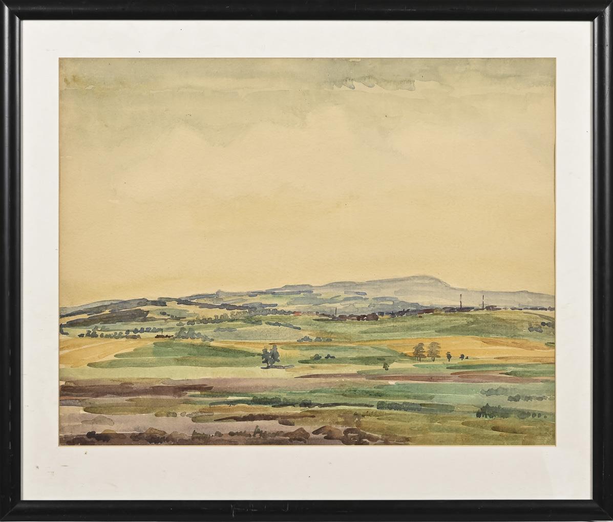 Weite Landschaft mit Feldern nahe einer Stadt unter bedecktem Himmel.