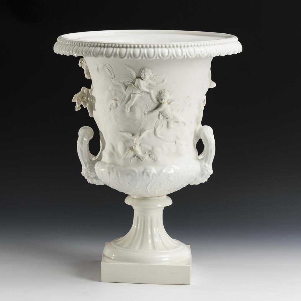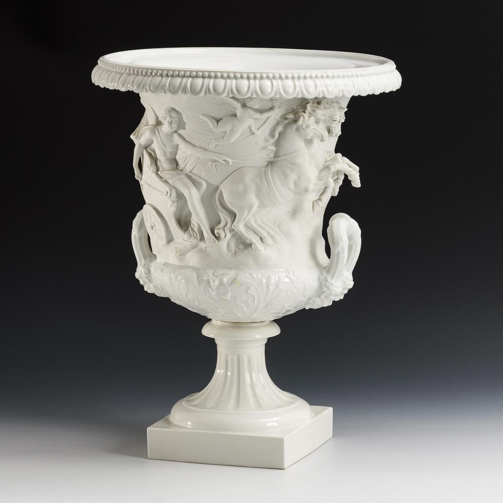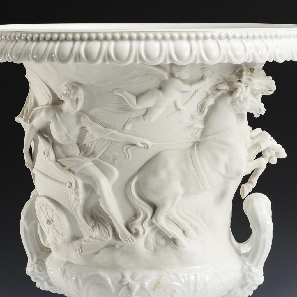 Kraterform mit zwei Handhaben, gerade godroniertem Fuß und Quadratplinthe. Umlaufend die reliefierte Biskuitdarstellung des Gottes Helios im von vier Pferden gezogenem Sonnenwagen, verso ein schwebendes Puttenpaar mit schnäbelnden Tauben. 2 Pferdebeine und beide Taubenköpfe restauriert.