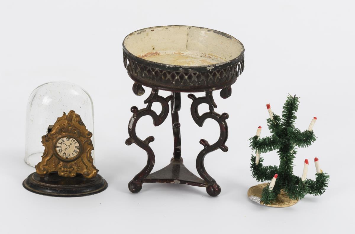 Seltenes 3-Sitzer-Sofa, neobarocker Armlehnstuhl und runder Blumentisch mit geschweiften Beinen. Dazu Tischuhr mit Glassturz, Weihnachtsbäumchen und 2 Wandbilder. Lackdefekte, keine Auffälligkeiten unter UV-Licht.