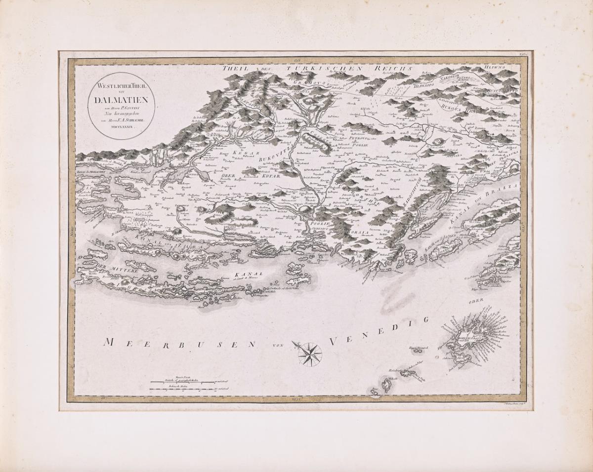 Landkarte des westlichen Teils der historischen Region Dalmatien, herausgegeben von Franz Anton Schraembl; verso in Tinte "Dalmatien". Stärker griffspurig, etwas knickspurig.