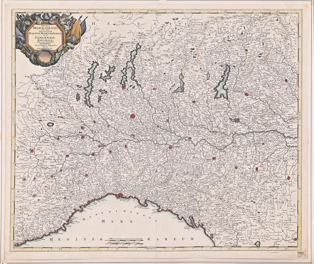 Historische Landkarte von Oberitalien, mit Titelkartusche "Status Mediolanensis, nec non ducatum Mantua, Modenae, Parmae ut et Genuensis Reipublicae [...]". Bugfalte, griffspurig.