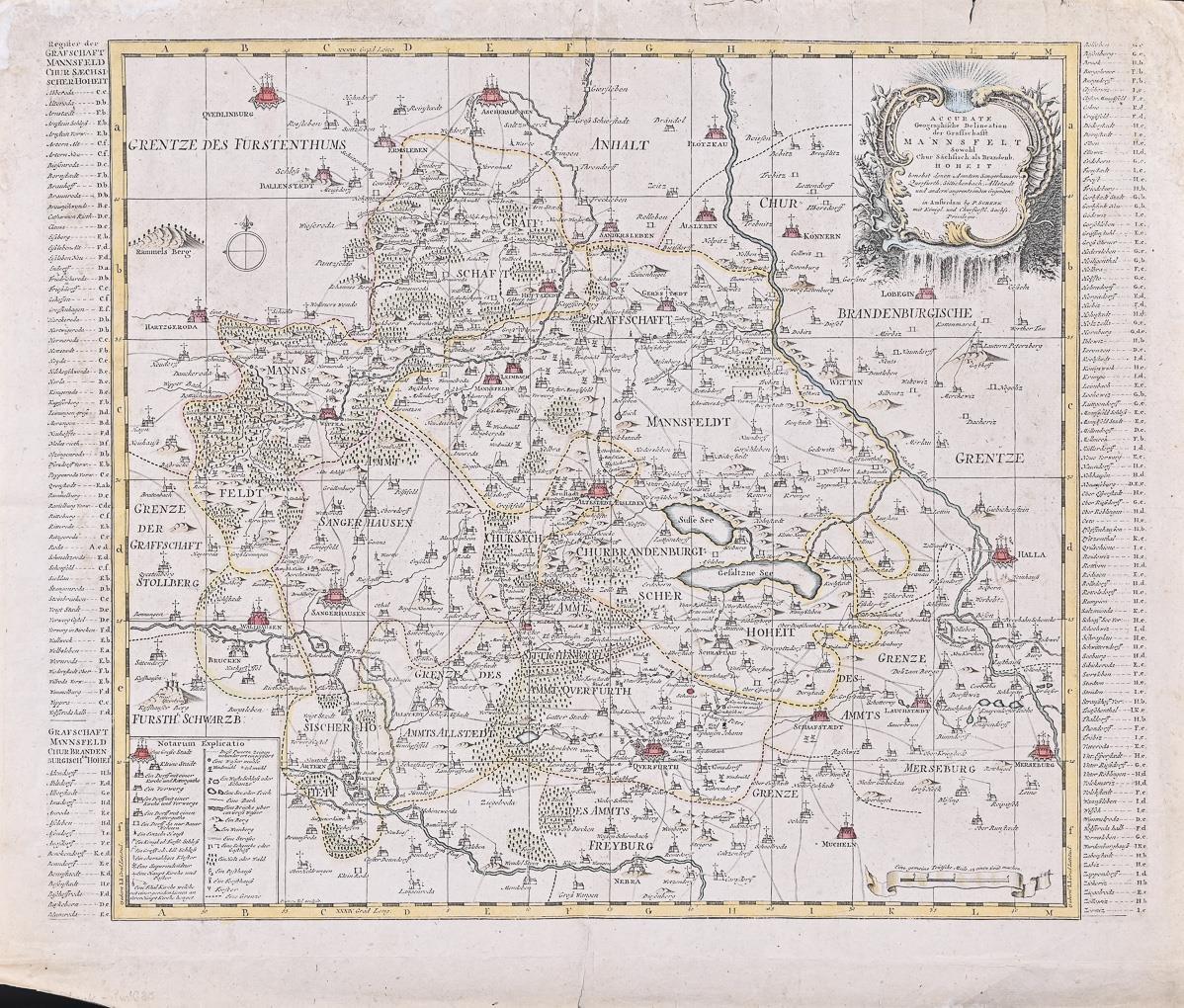 Historische Karte der Grafschaft Mansfeld, mit figürlicher Titelkartusche "Accurate Geographische Delineation der Graffschaft Mannsfelt Sowohl Chursächsisch : als Brandenbur. Hoheit [...]" und ausführlicher Legende. Doubliert, stockfleckig, knick- und griffspurig, Randbereich rissig.