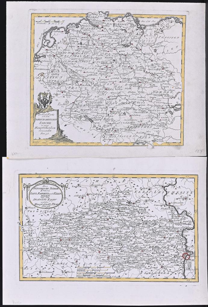 Historische Landkarte des Heiligen Römischen Reiches, Titelkartusche mit Wappen "Spezial-Karte von dem römisch=deutschen Reiche in seinen Haupttheilen dargestellet. Nro. 93", Blatt: 28,5 x 37 cm und Landkarte des Gebiets zwischen Eger und Prag im Königreich Böhmen, Titelkartusche "Des Königreichs Böheim Kreise Saatz, Rakonitz und Ellenbogen mit dem Distrikte Egger und der Hauptstadt Prag, Nro. 96"; aus "Schauplatz der fünf Theile der Welt", 1789 - 1806. Je griffspurig.
